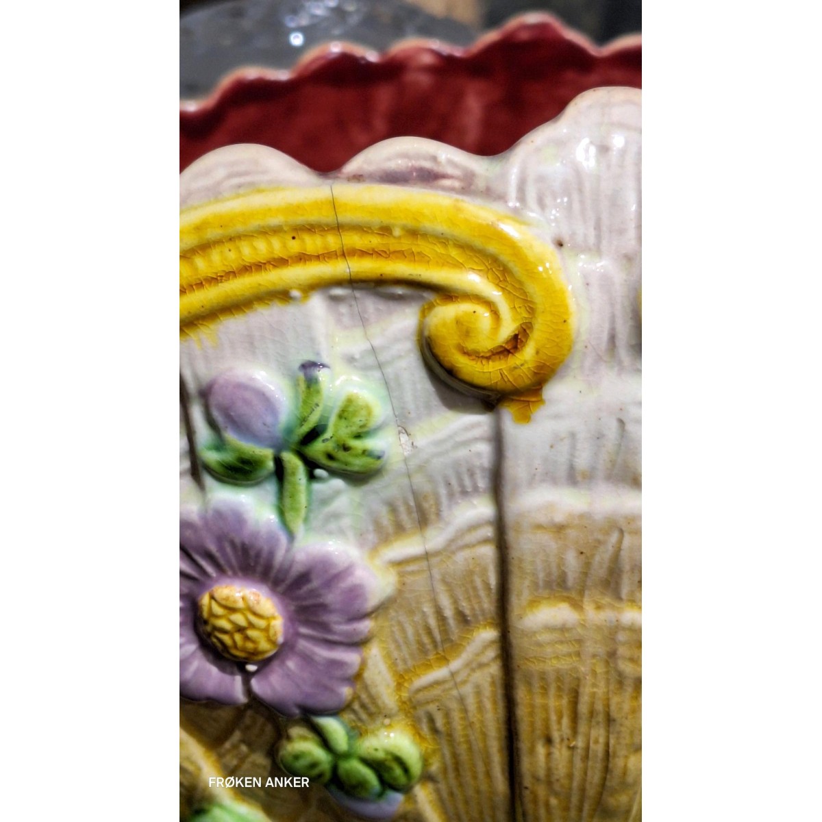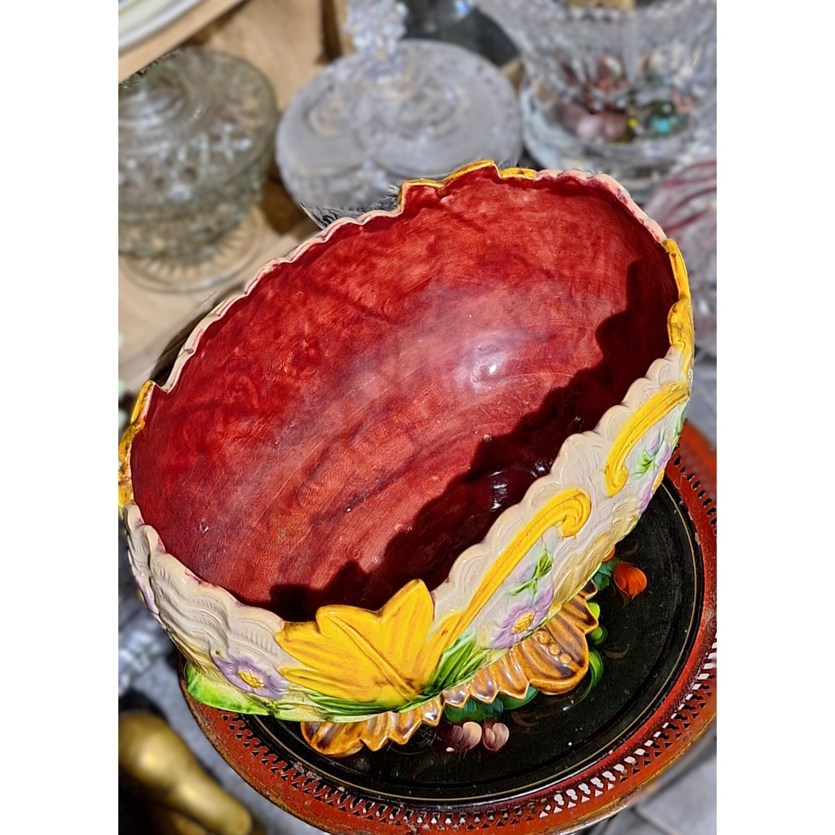 Stor smuk gammel fransk Art Nouveau jardiniere. Der er blomstermotiv på begge sider. Den er meget velholdt. Det er en gammel brugtvare, så der forekommer brugspatina. Bl.a er der en lille revne i glasuren på ydersiden. Ikke på indersiden - SE BILLEDER