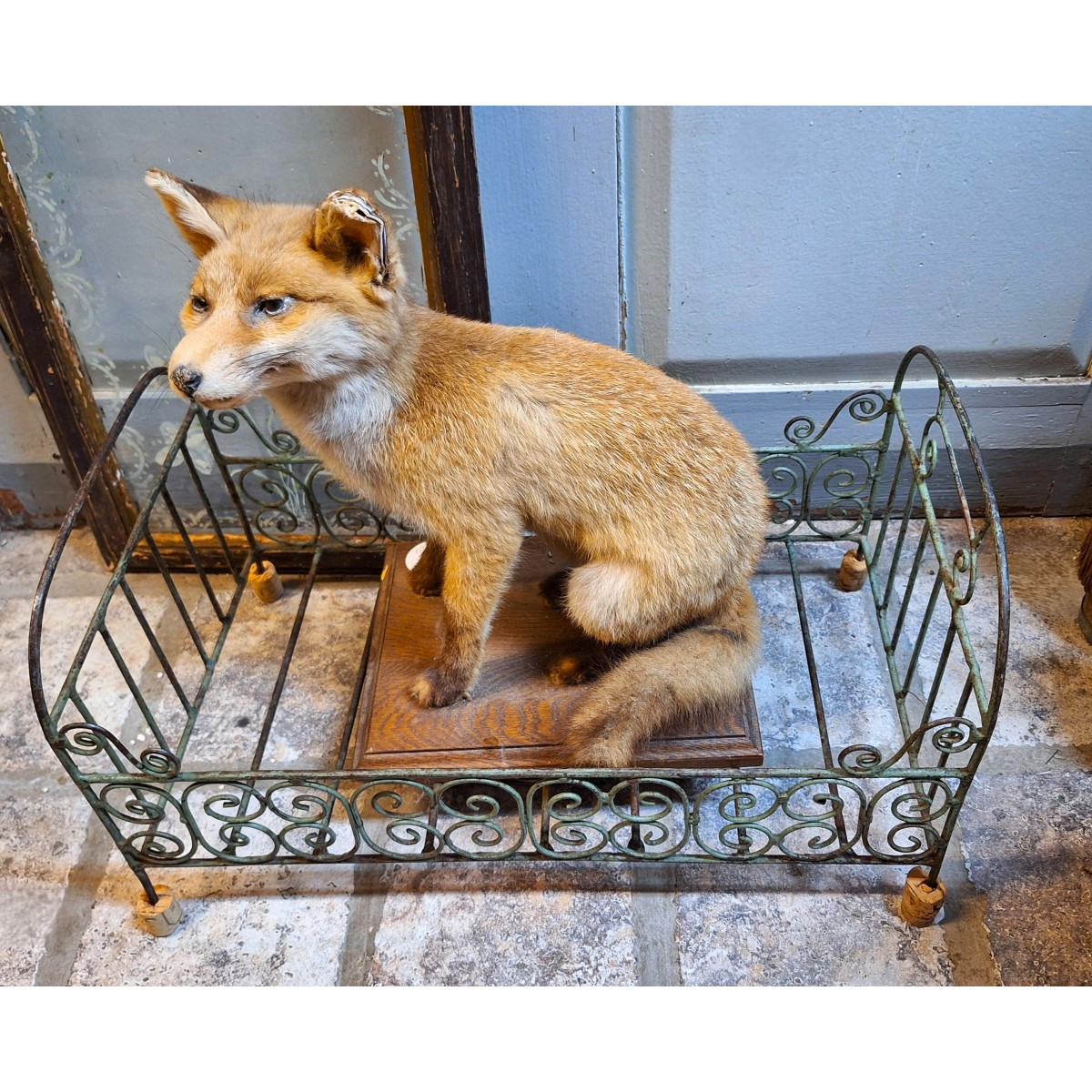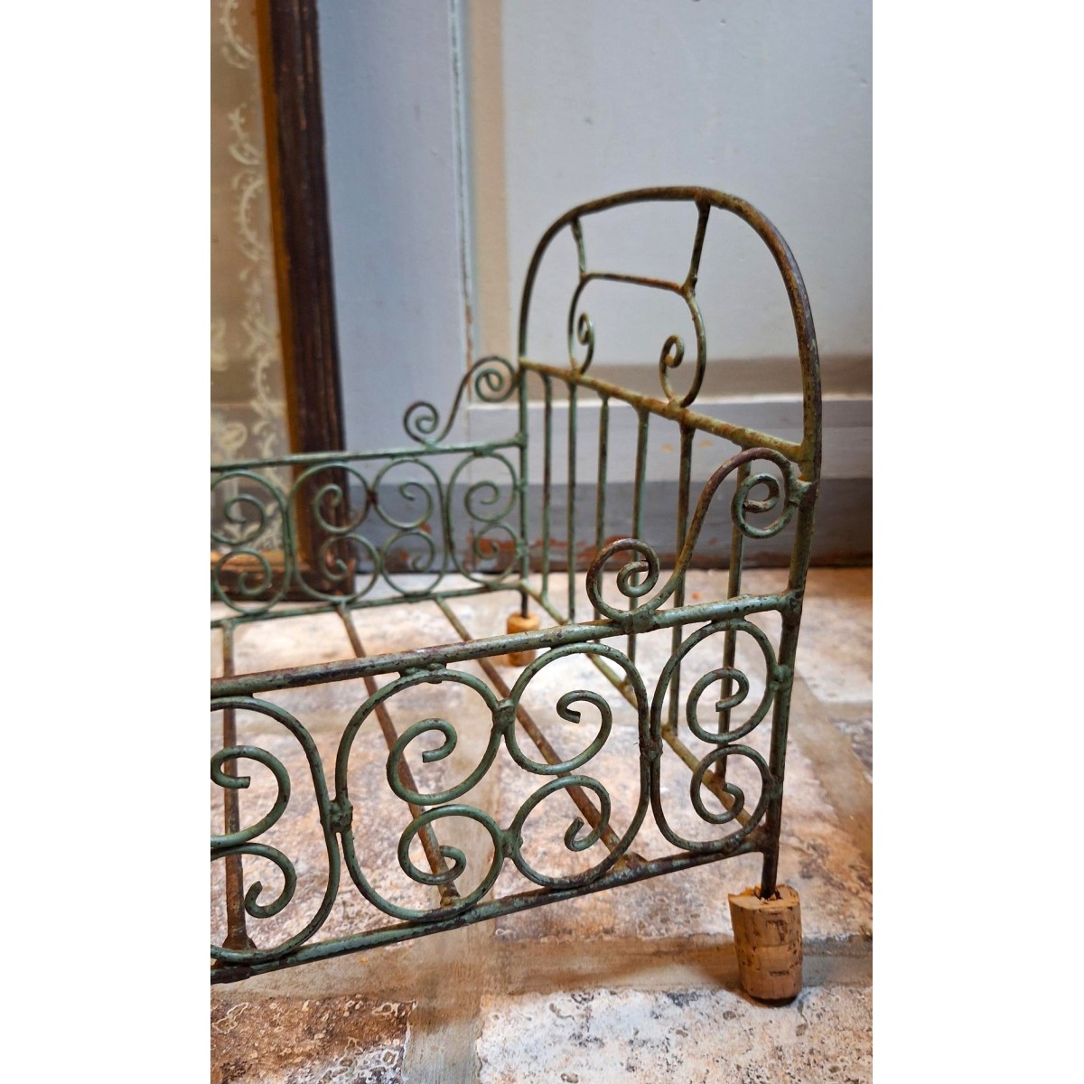 Antik fransk jern dukkeseng fra start1900-tallet. Oprindelig farve har været mandelgrøn. Sengen er i meget god stand - SE BILLEDER. Der forekommer brugsrelateret patina i overfladen. Og så mangler der en korkprop på det ene ben, der formentlig er sat på, for at beskytte mod ridser på gulve mm.