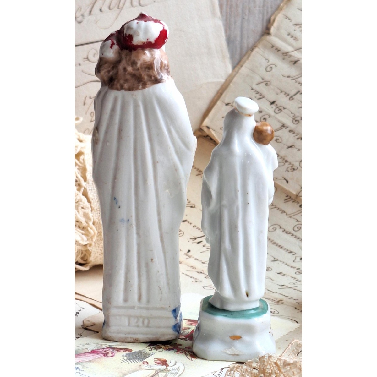 De to madonnafigurer sælges samlet. De er i porcelæn, og håndmalet. Noget af malingen er med årene blevet slidt af - SE BILLEDER, der er en del af beskrivelsen.