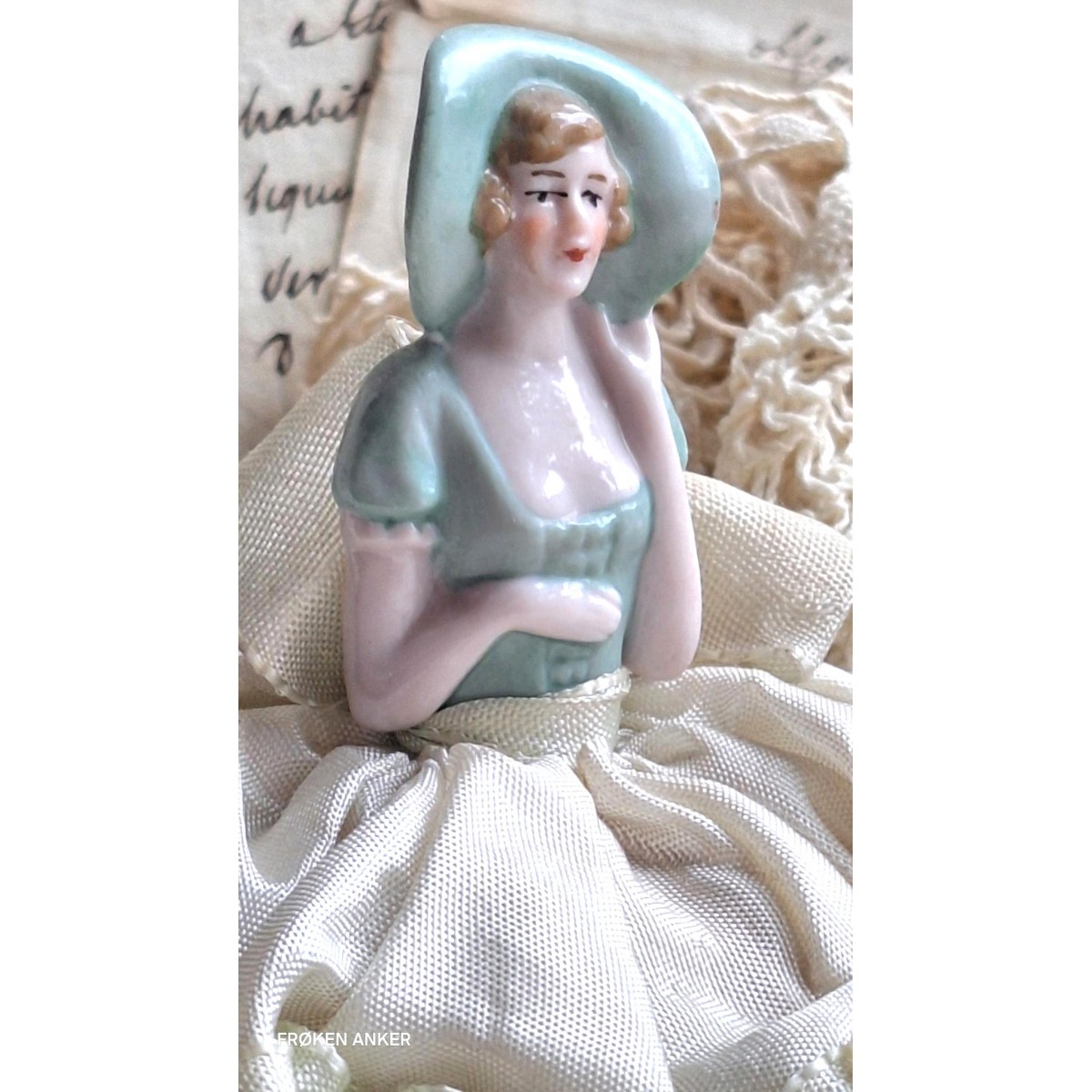 En yndig antik half doll. Benene, med fine sko, stikker ud under kjolen. Kroppen er lavet som en nålepude...Læs mere