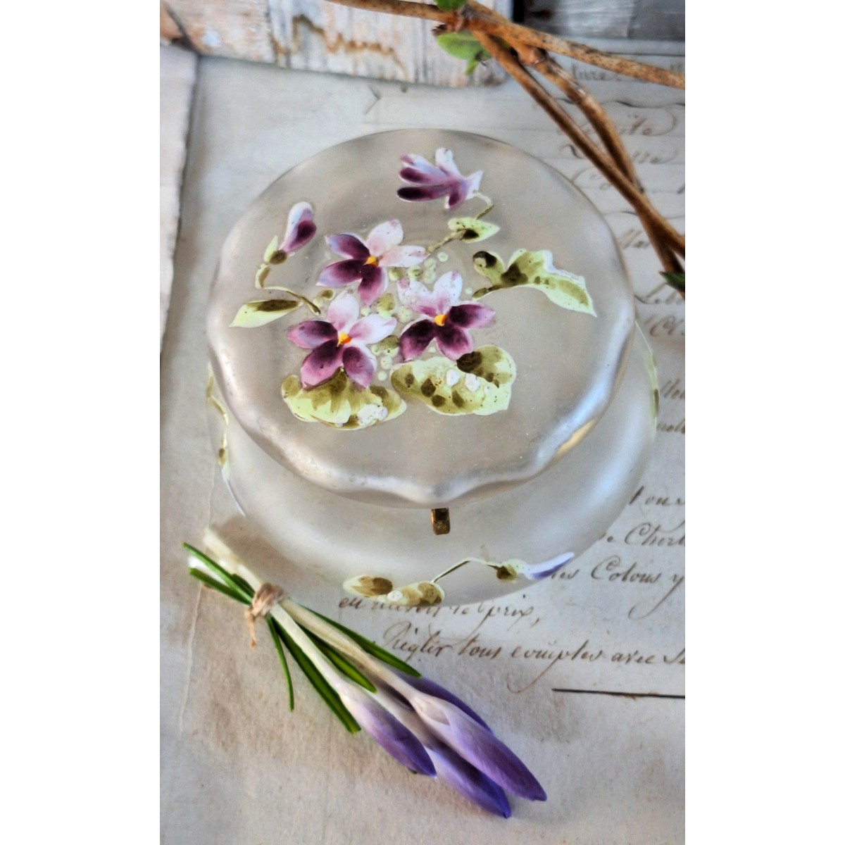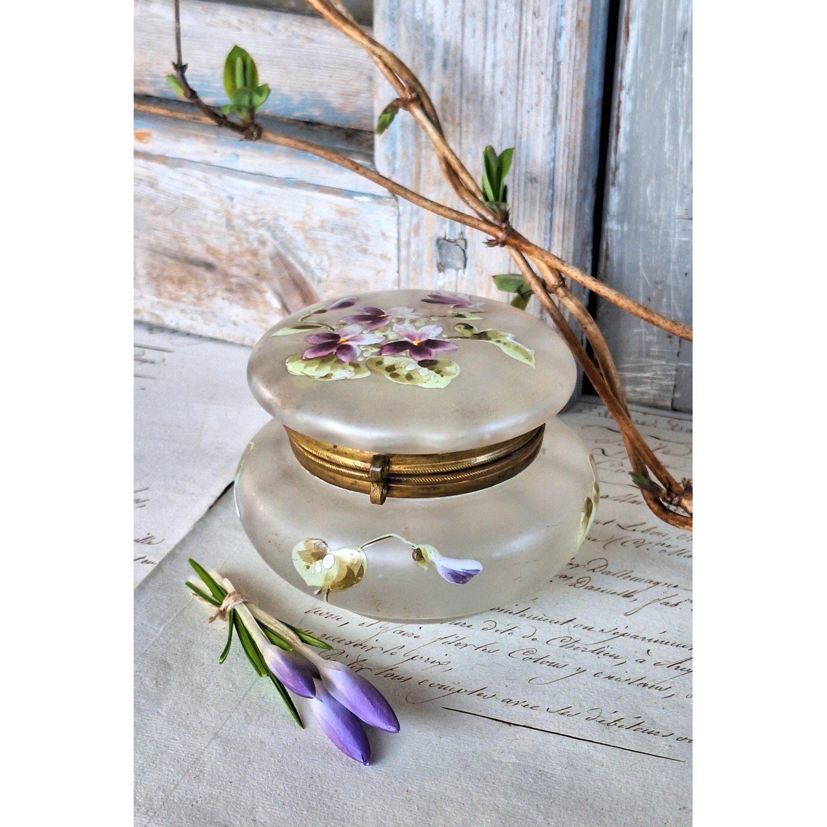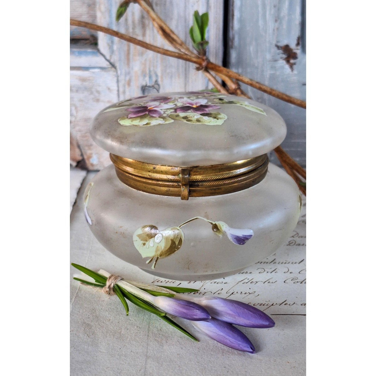 Antik emaljemalet bonbonniere i glas og messing, og med håndmalet blomstermotiv i smukke farver. Det er fra omkring 1900. Glasset er frostet. Luftbobler forekommer i glasset. Skrinet er i en god brugt stand, alderbetinget patina forekommer...SE BILLEDER