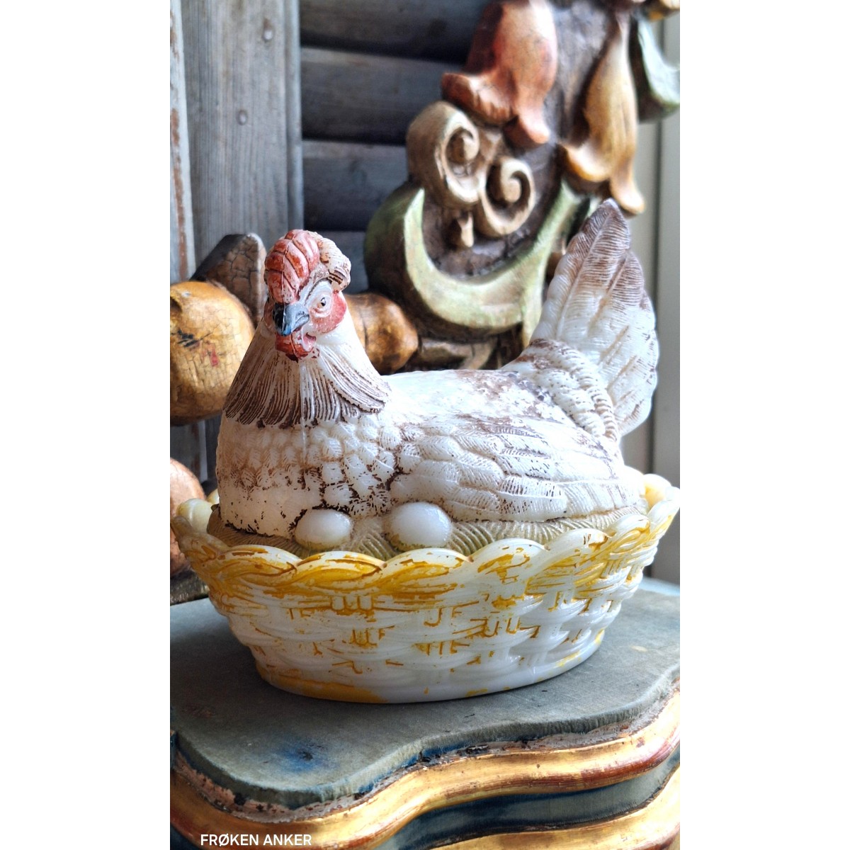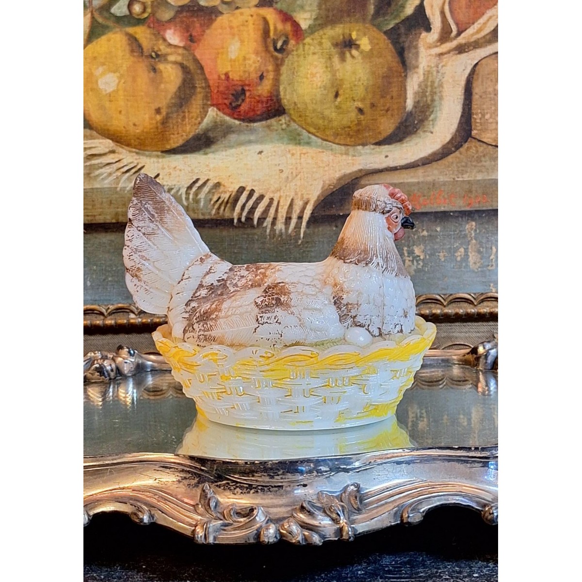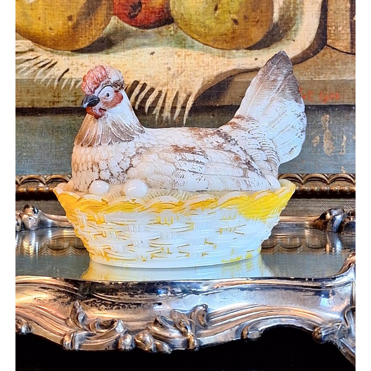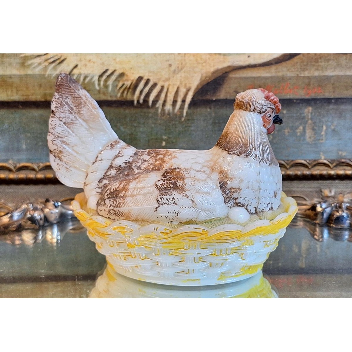 En fin antik bonbonniere høne i opalglas. Rester fra den originale bemaling forefindes. En sød bonbonniere, der kan stå fremme såvel til påske, som året rundt. Brugspatina forekommer, men meget flot, alderen taget i betragtning...SE BILLEDER..