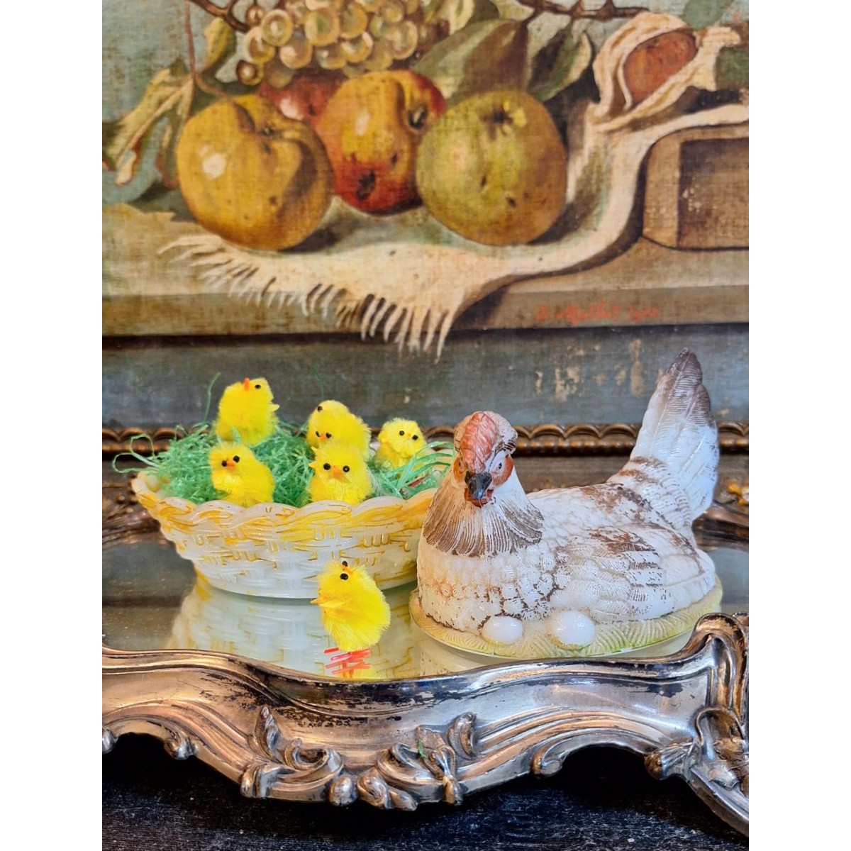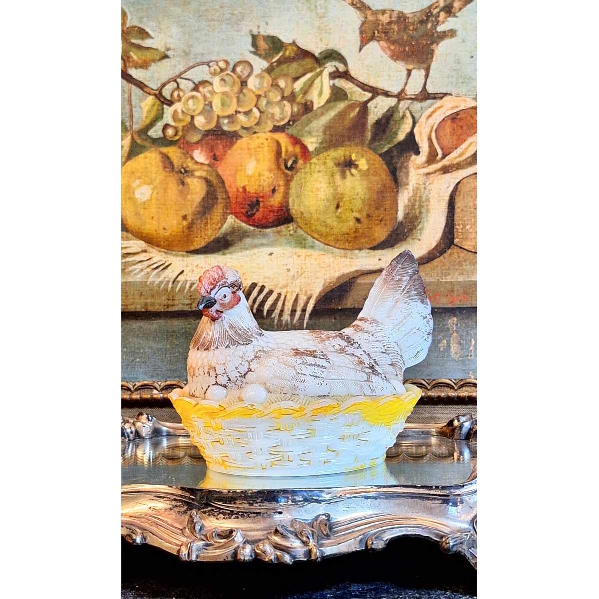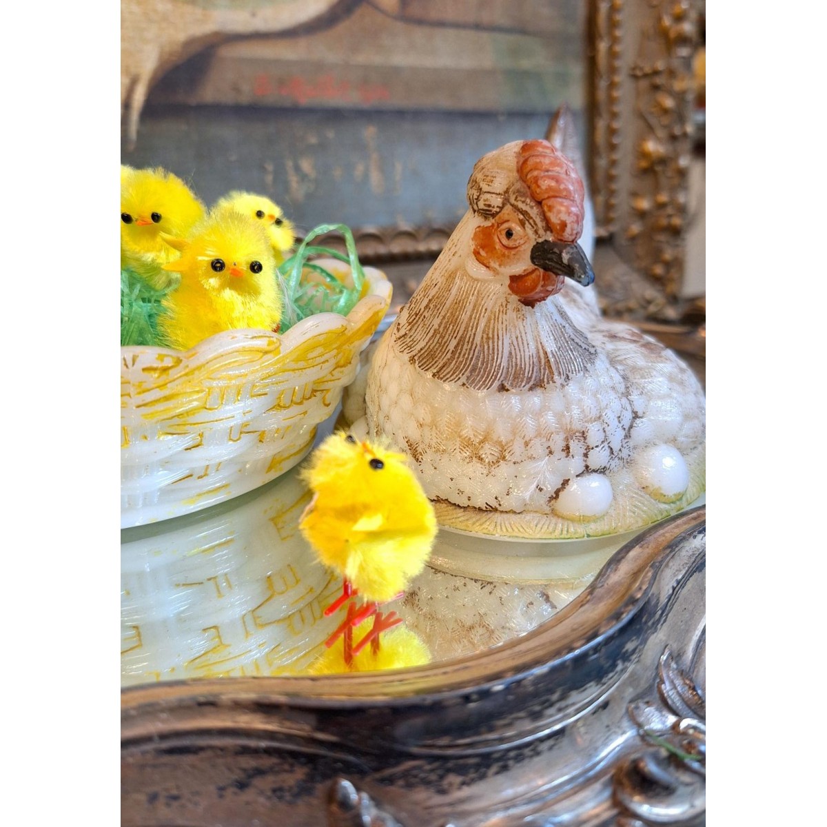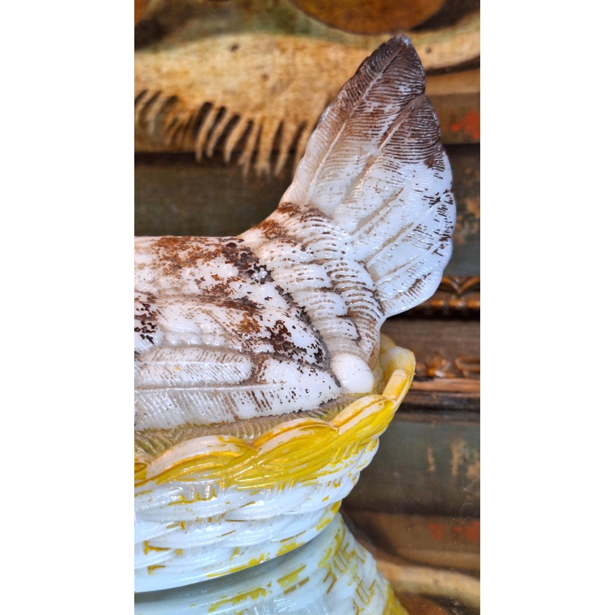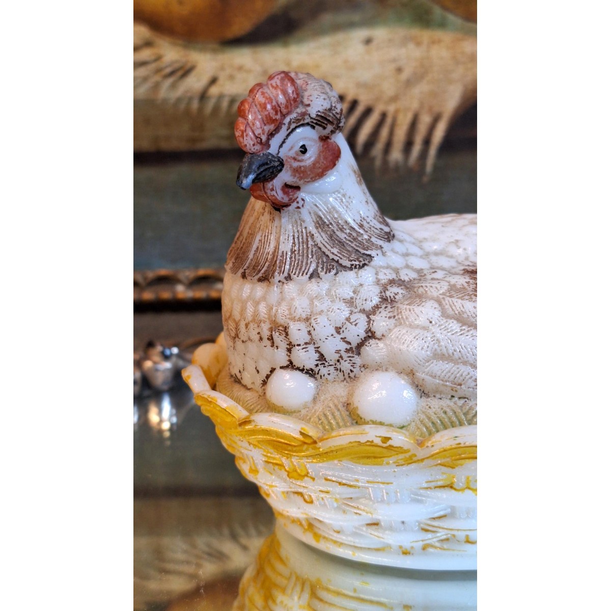En fin antik bonbonniere høne i opalglas. Rester fra den originale bemaling forefindes. En sød bonbonniere, der kan stå fremme såvel til påske, som året rundt. Brugspatina forekommer, men meget flot, alderen taget i betragtning...SE BILLEDER..