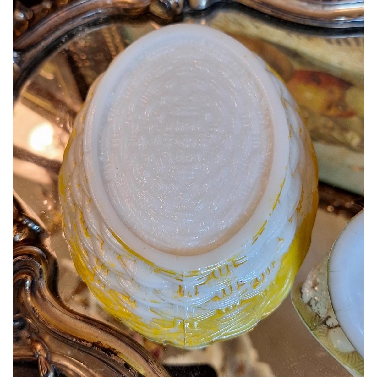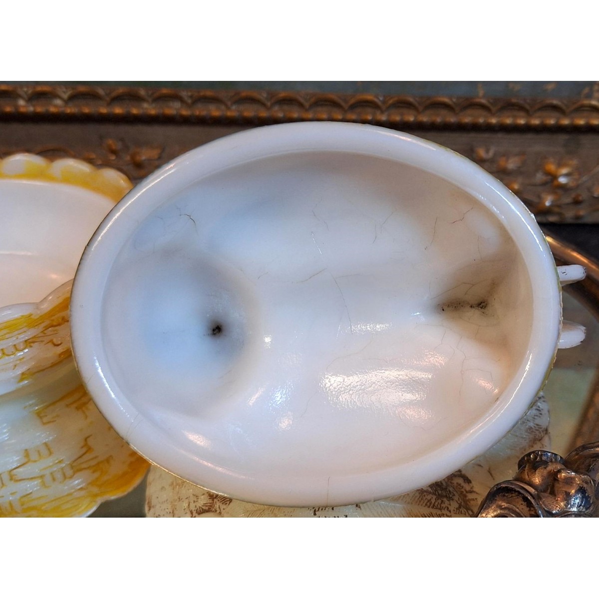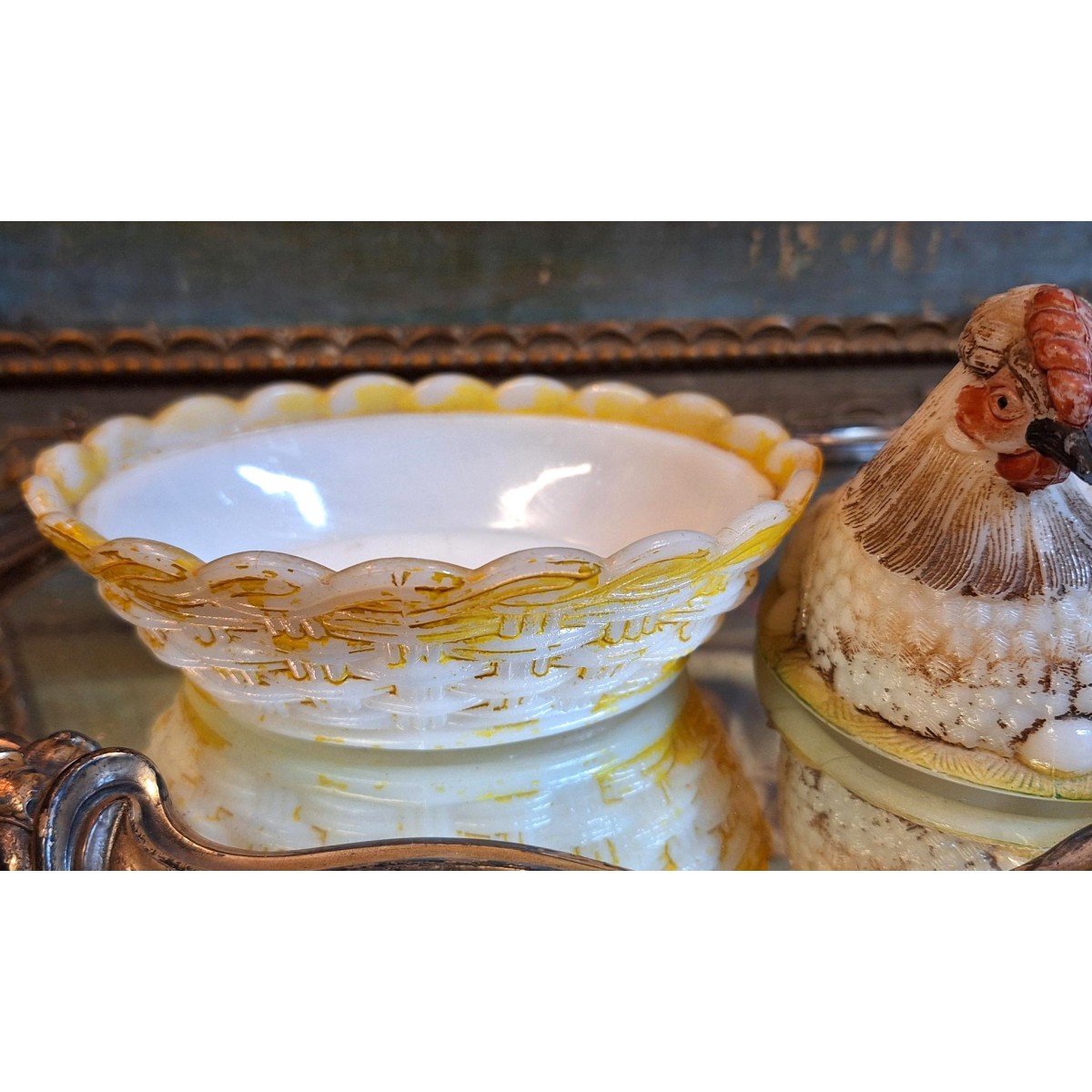 Se fuld størrelse Antik Bonbonniere HØNE Opalglas (12x15cm)