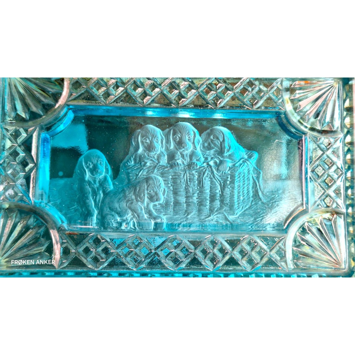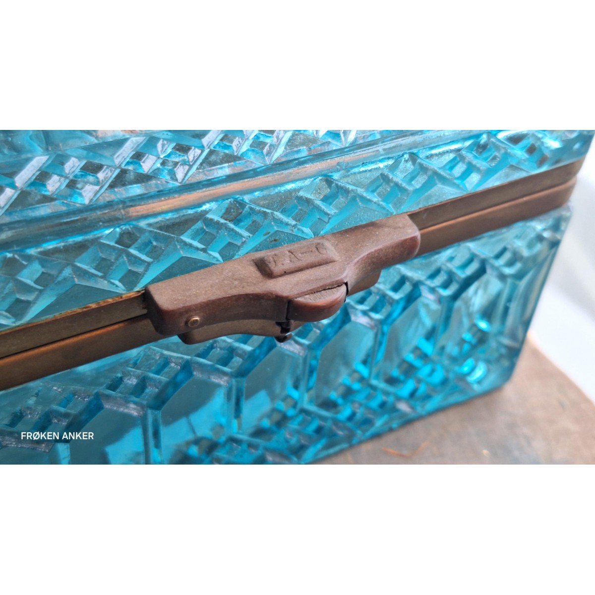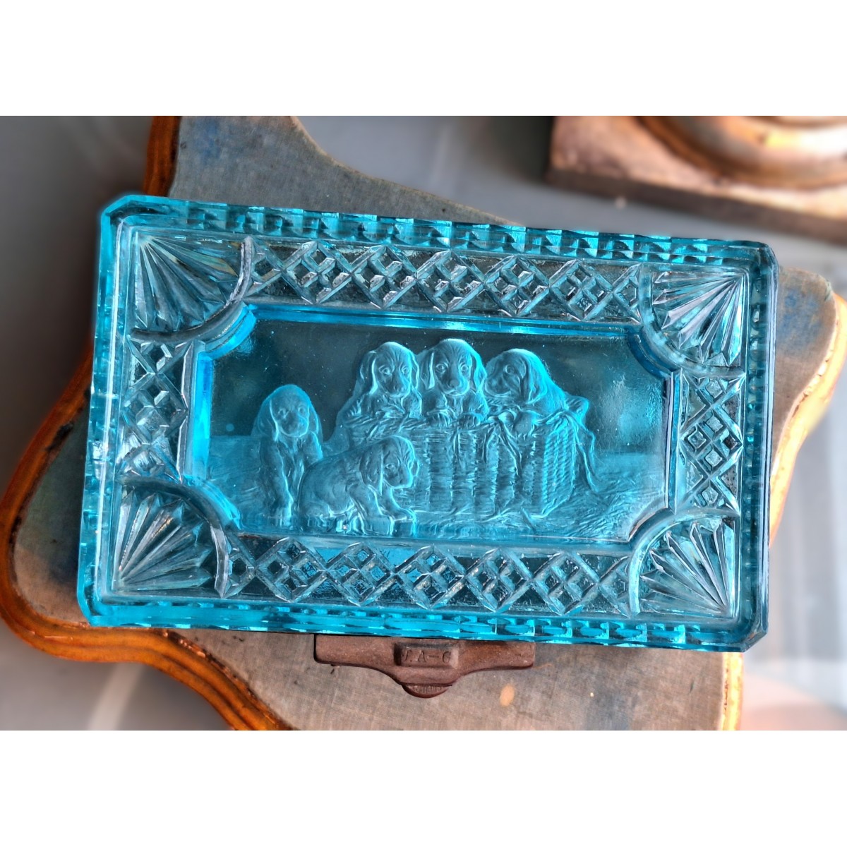 Et smukt, antikt glasskrin i præget krystalglas, med små hundehvalpe præget i låget. En metalkant, med lås (nøglen mangler) er ved låget. Kanten er med tiden blevet mørk af tidens tand. Skrinet er flot i den turkise farve..SE BILLEDER, der er en del af beskrivelsen. En lille revne i glasset, på låget, forekommer.