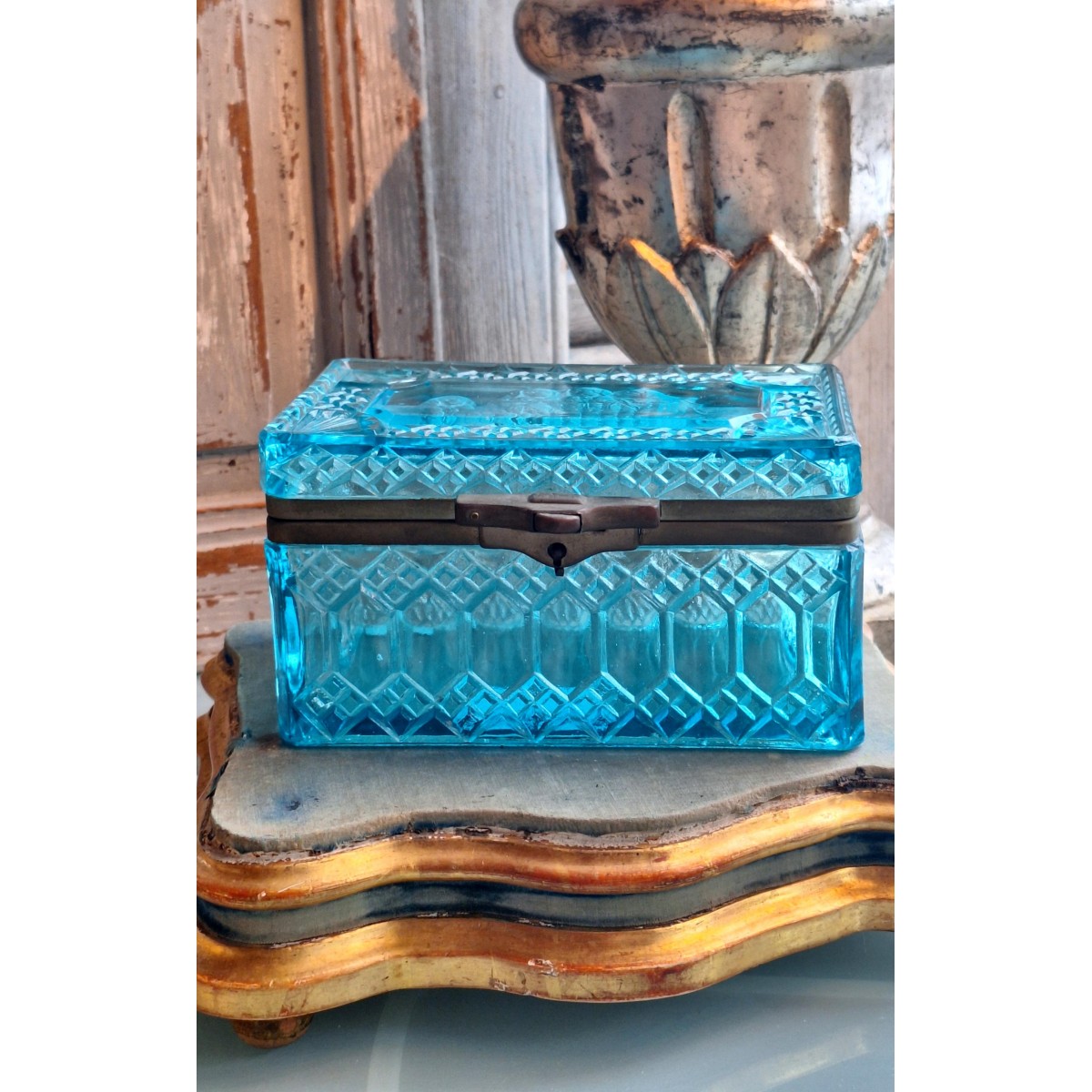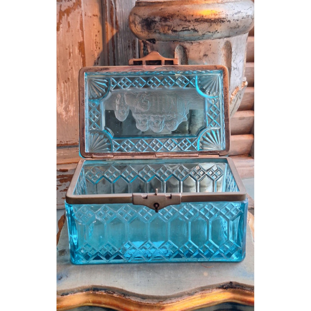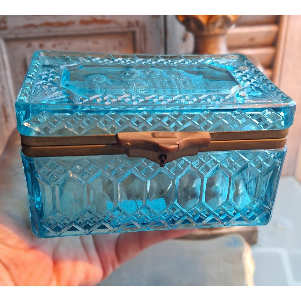 Et smukt, antikt glasskrin i præget krystalglas, med små hundehvalpe præget i låget. En metalkant, med lås (nøglen mangler) er ved låget. Kanten er med tiden blevet mørk af tidens tand. Skrinet er flot i den turkise farve..SE BILLEDER, der er en del af beskrivelsen. En lille revne i glasset, på låget, forekommer.