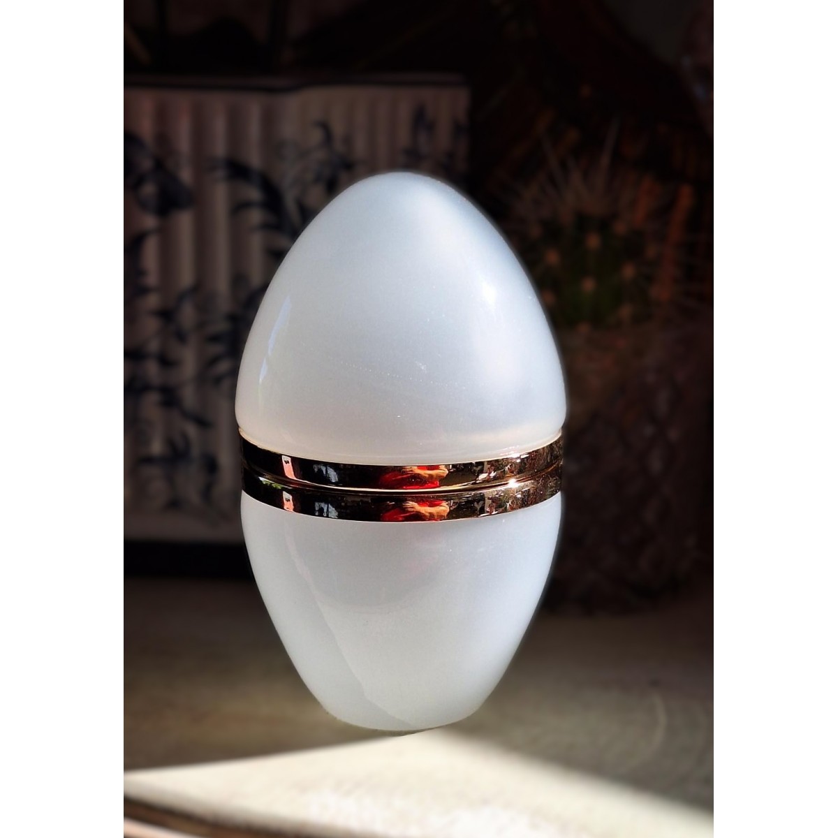 Se fuld størrelse Det fine franske glasskrin i hvidt opalineglas, er formet som et æg. Det er fra 1920'erne. Opalineægget har en glat guld-kant...Læs mere