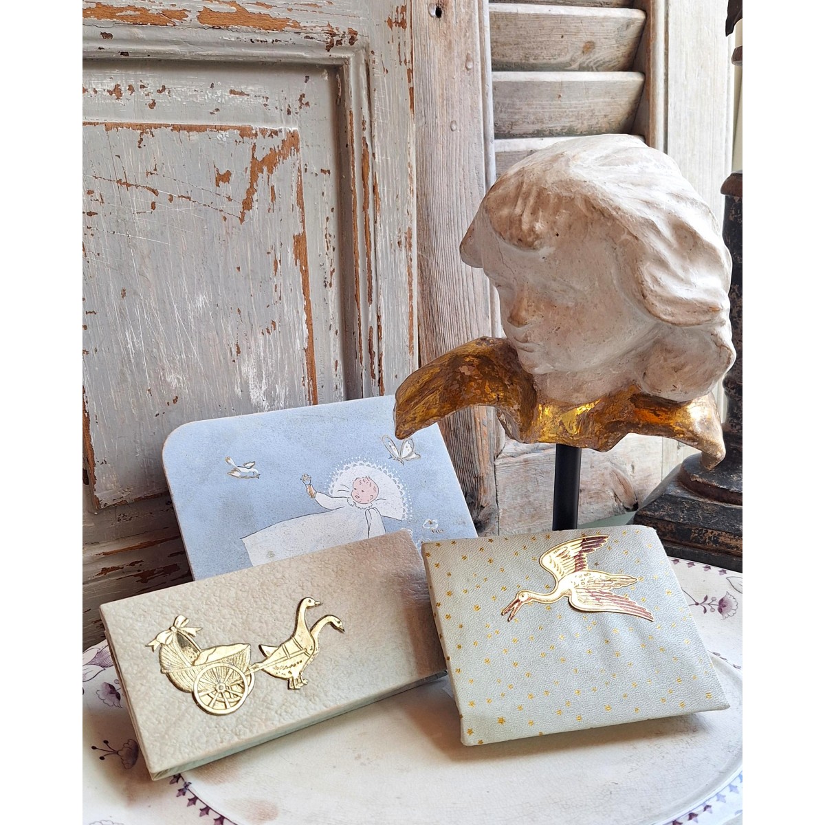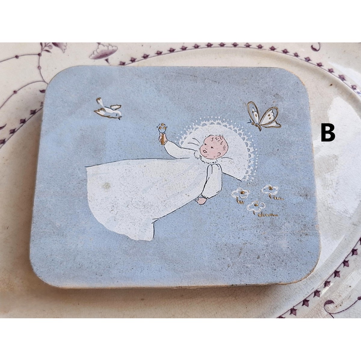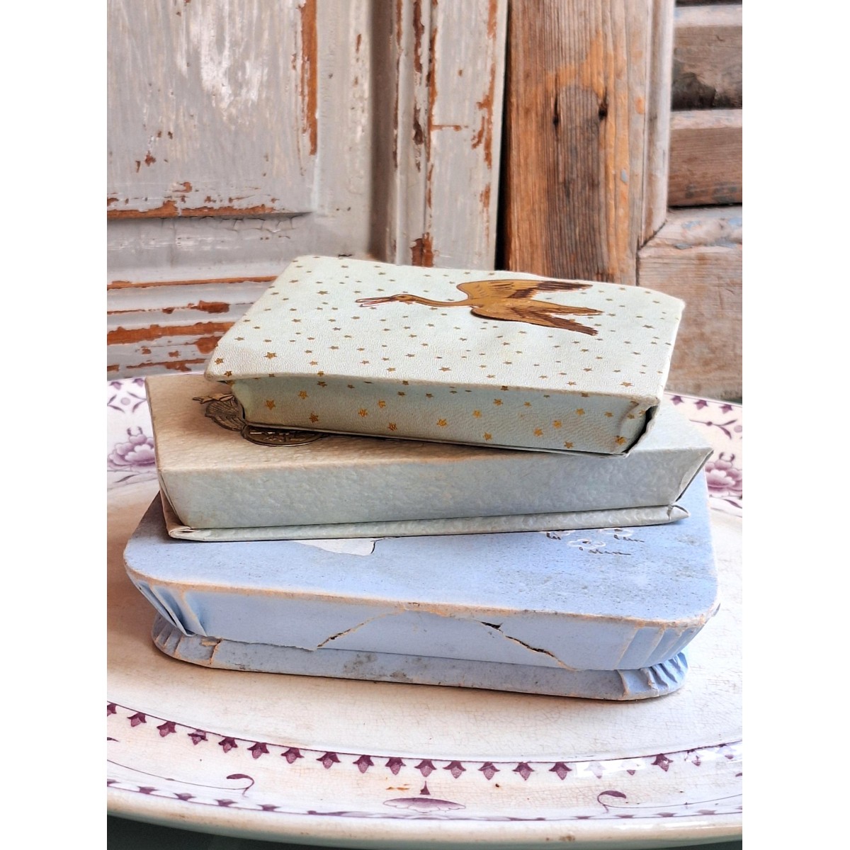 Gamle fine franske dåbsæsker, med tanke for detaljer. Æskerne har brugsspor, fx kan de være falmet, have skader i papiret mm.. SE BILLEDER..Æskerne er håndlavet, og hånddekoreret.
