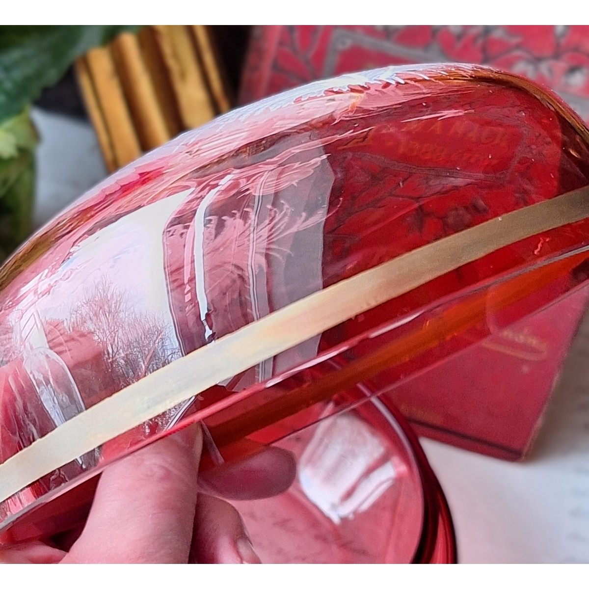 Se fuld størrelse Rød Glas Bonbonniere med Snemaleri [9xØ14cm]