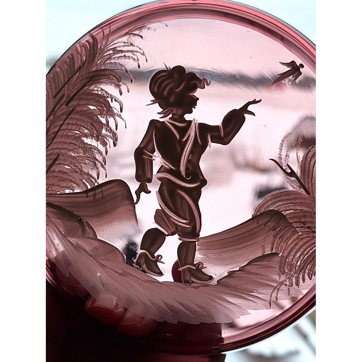 Se fuld størrelse Meget smuk ældre glas bonbonniere med et fint snemaleri af et legende barn - læs mere