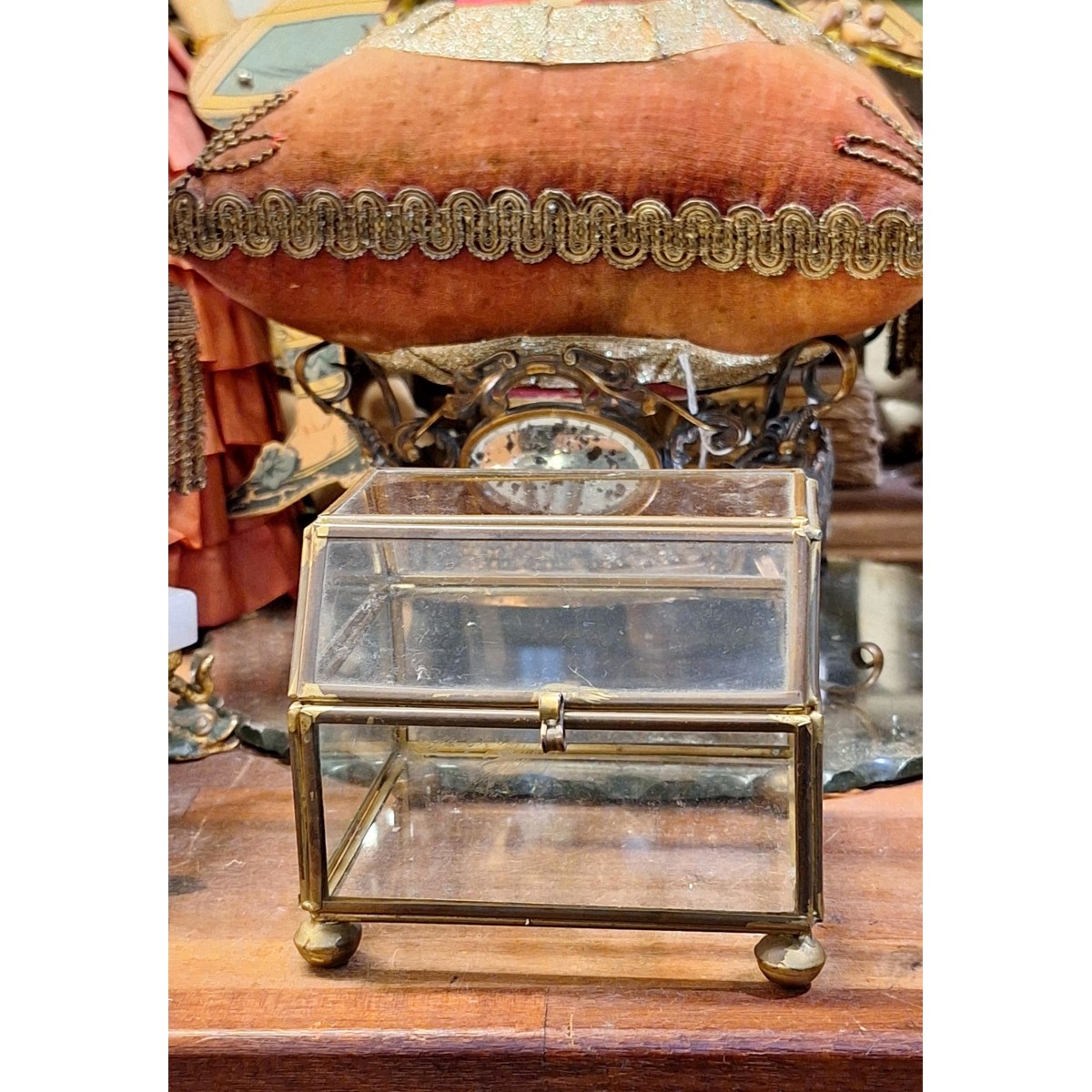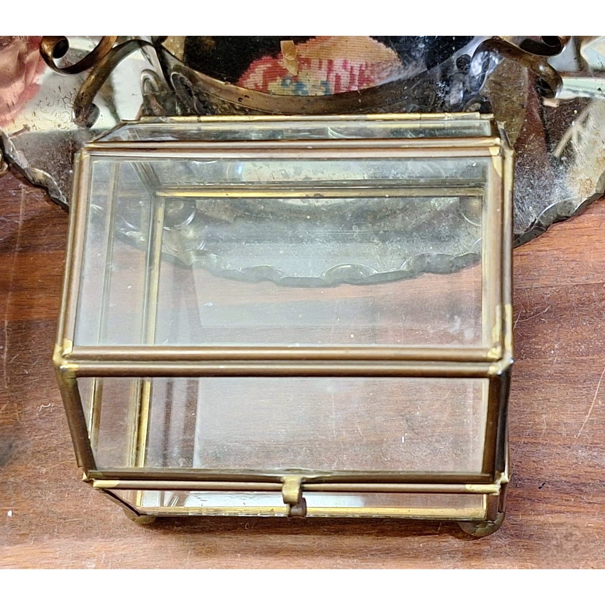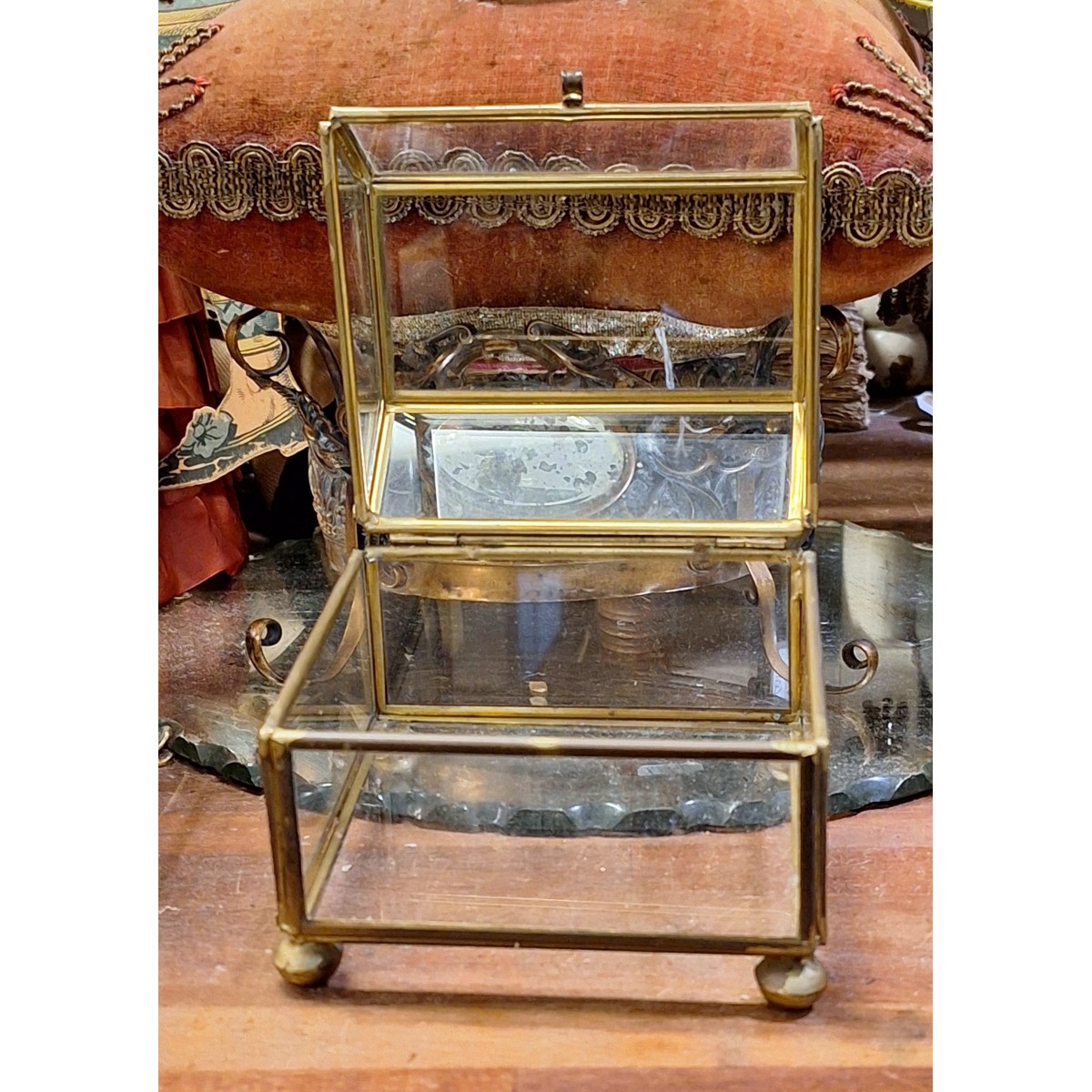En meget smuk, og velholdt, fransk smykkeæske i glas og messing. Der er glas i alle sider, bund og top. Den fine glas-æske kan bruges på mange måder...se billeder.. Let brugspatina forekommer