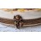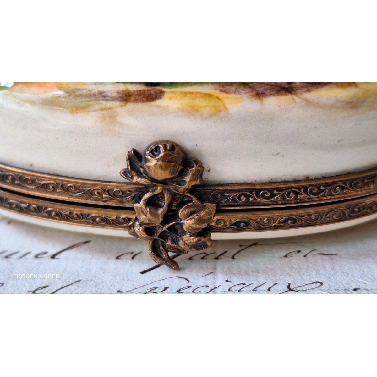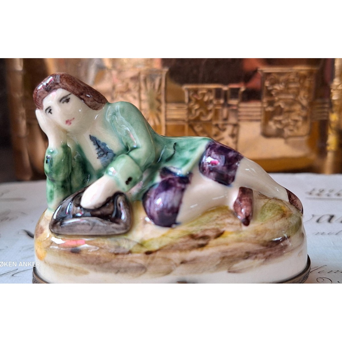 De små sjældne porcelænsæsker eller pilleæsker er dekoreret i relief med en liggende kvinde og mand .Messingkant med en rose til lukning af æsken med kvindemotivet, og et sæt værktøj til lukning af æsken med mandmotivet.
