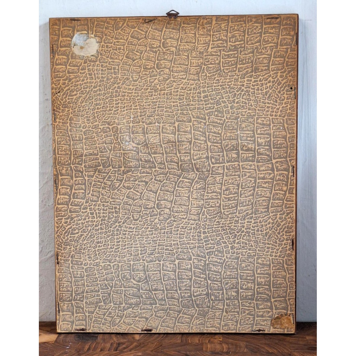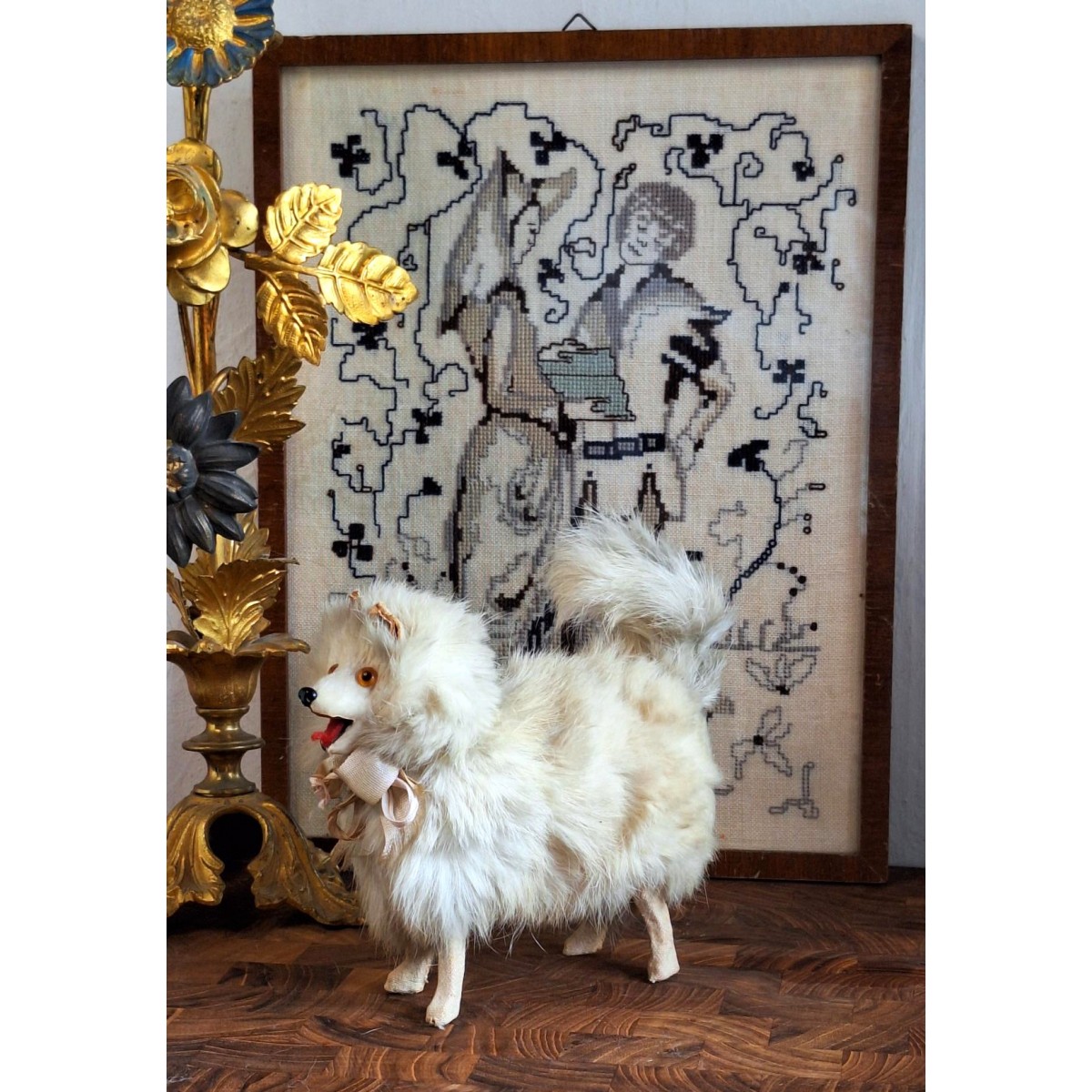Et smukt franskt billede, der er broderet, i en fin træ-finers ramme. På bagsiden er et ophæng. Pænt og velholdt, med let aldersbetinget patina.