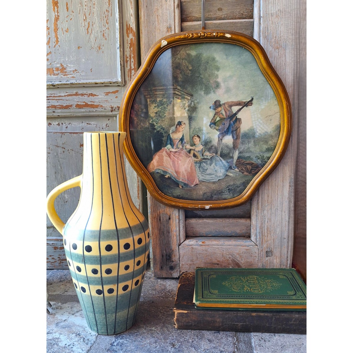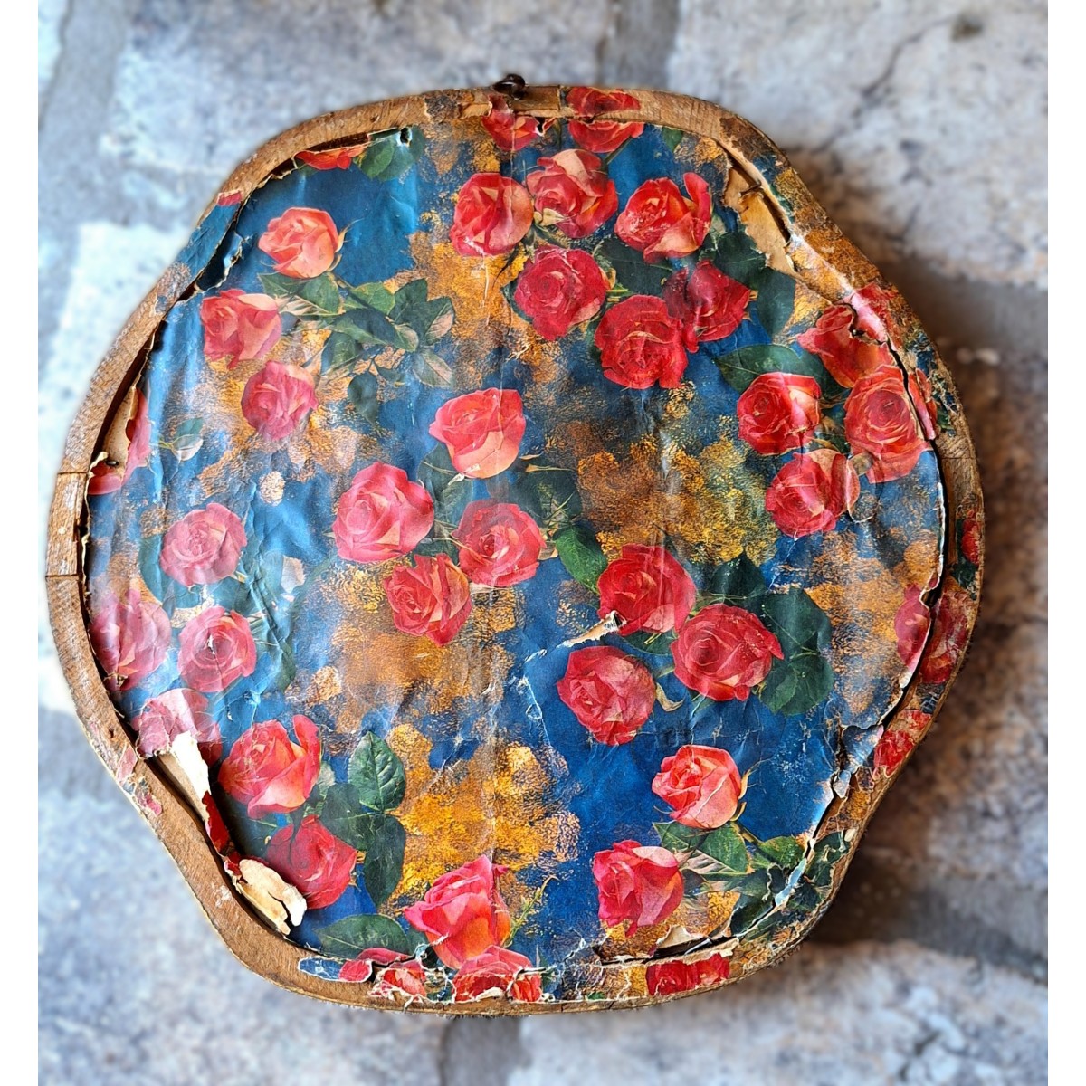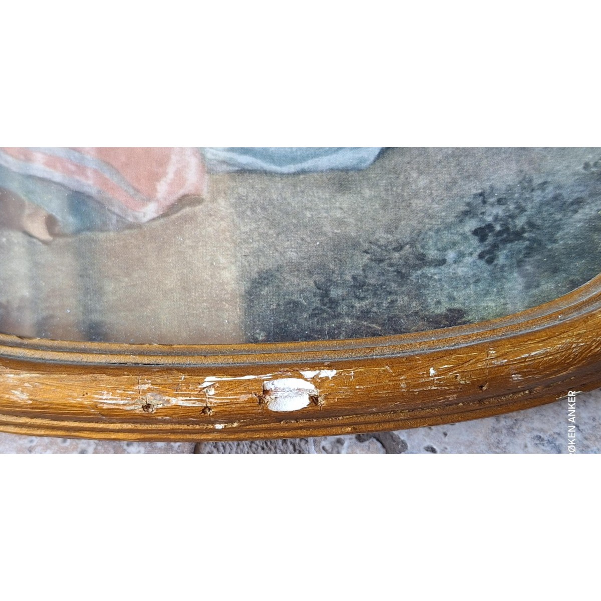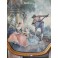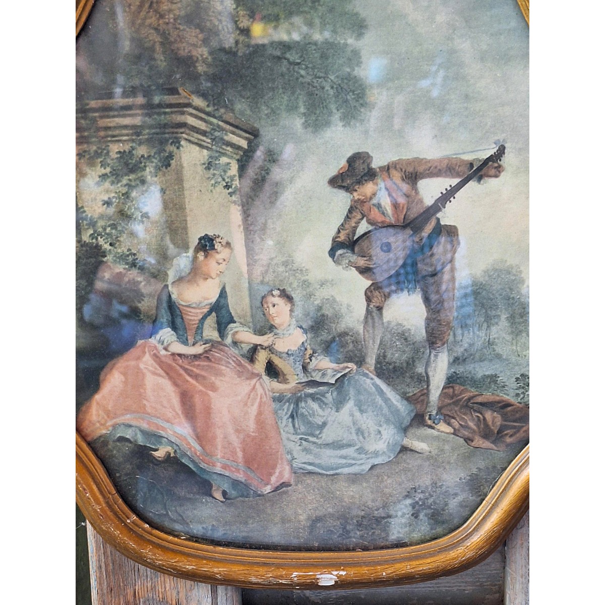 Det yndige billede har et sødt romantiskt motiv. Det er indrammet bag glas, i en forgyldt træramme, der er seks-kantet. Bagsiden er gammelt tapet eller lignende med roser. Der forekommer patina...SE BILLEDER