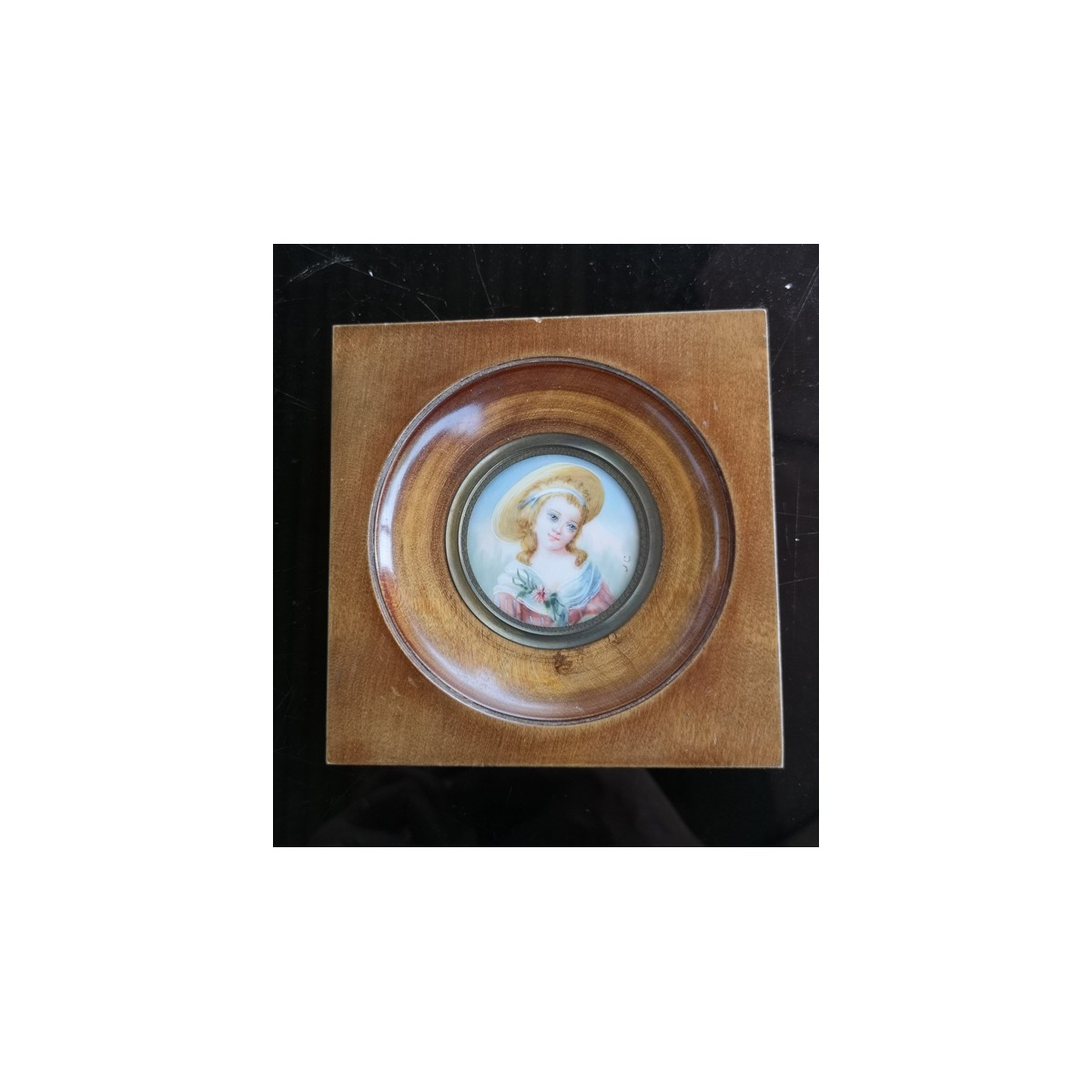 De små miniature billeder er meget populære blandt samlere. Billedet er i en smuk nøddebrun ramme. Det er håndmalet og er signeret.