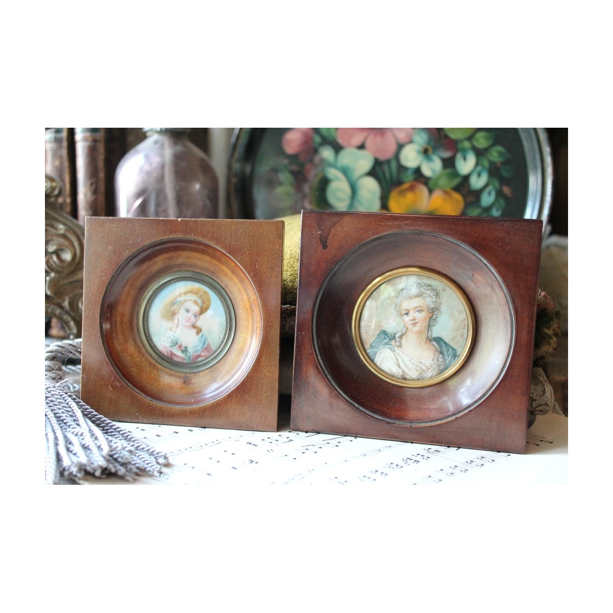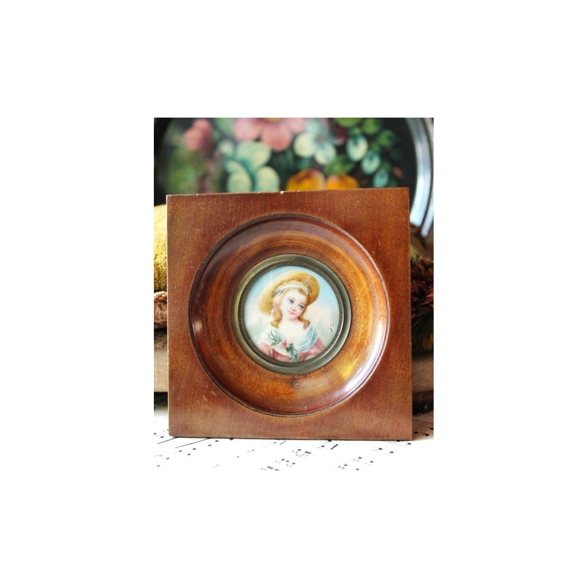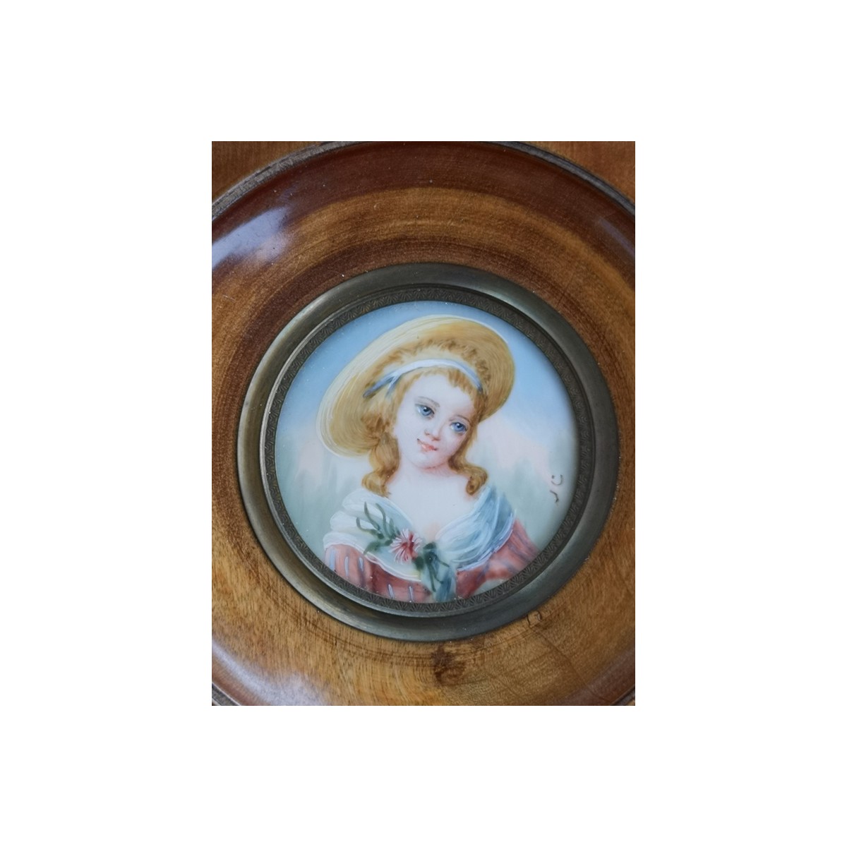 Se fuld størrelse De små miniature billeder er meget populære blandt samlere. Billedet er i en smuk nøddebrun ramme. Det er håndmalet og er signeret.