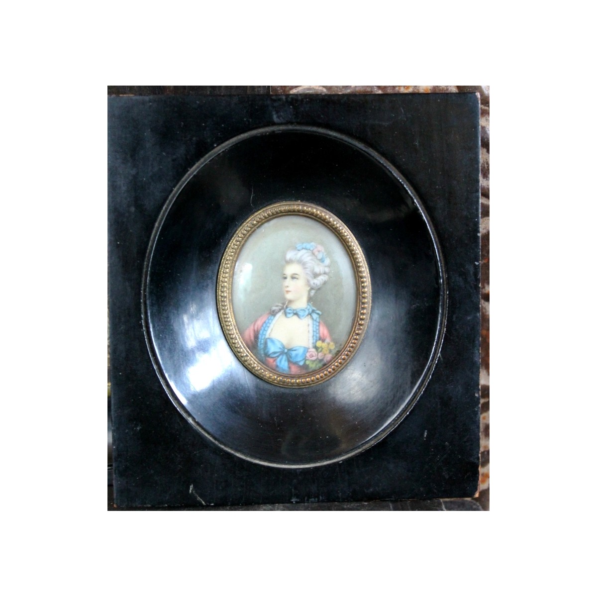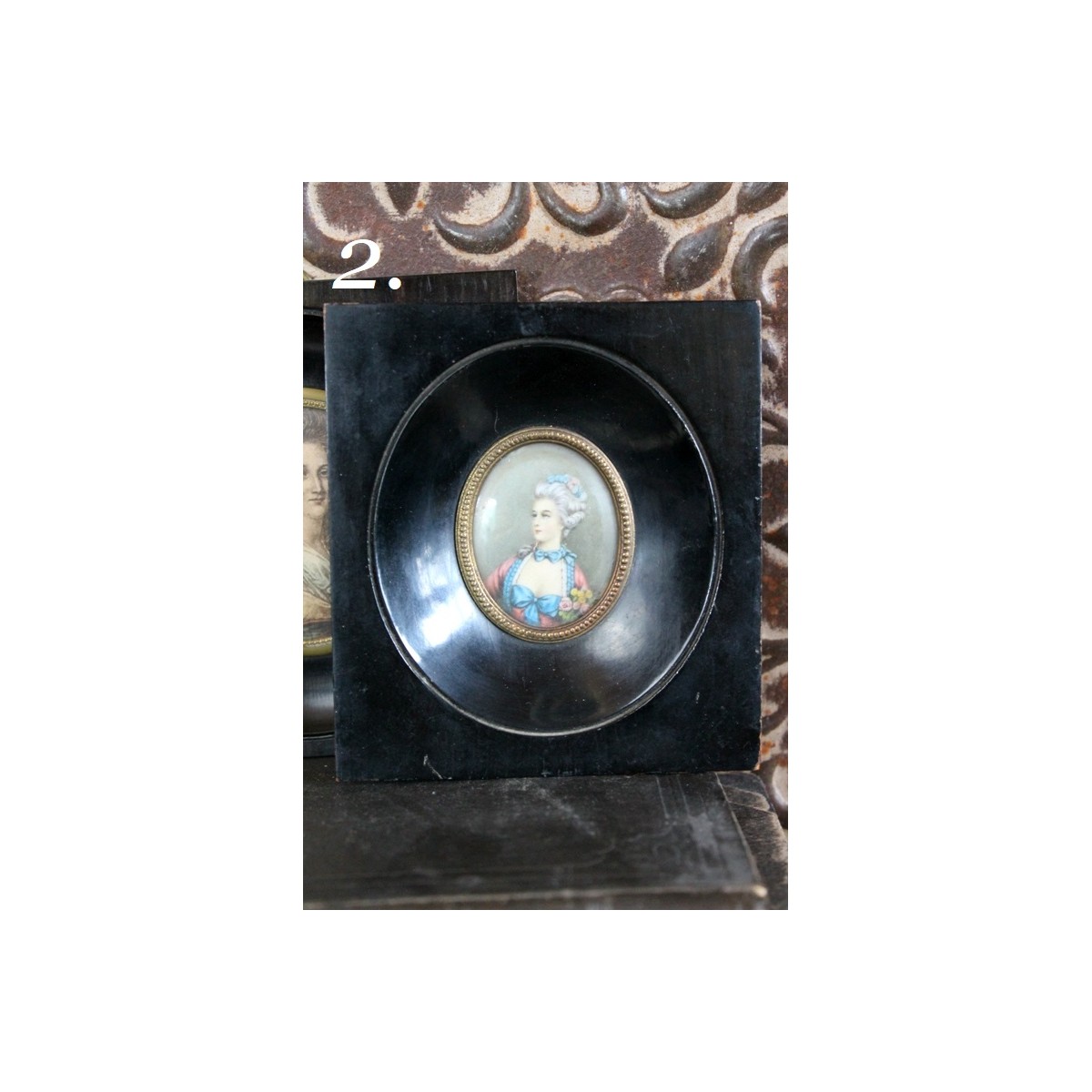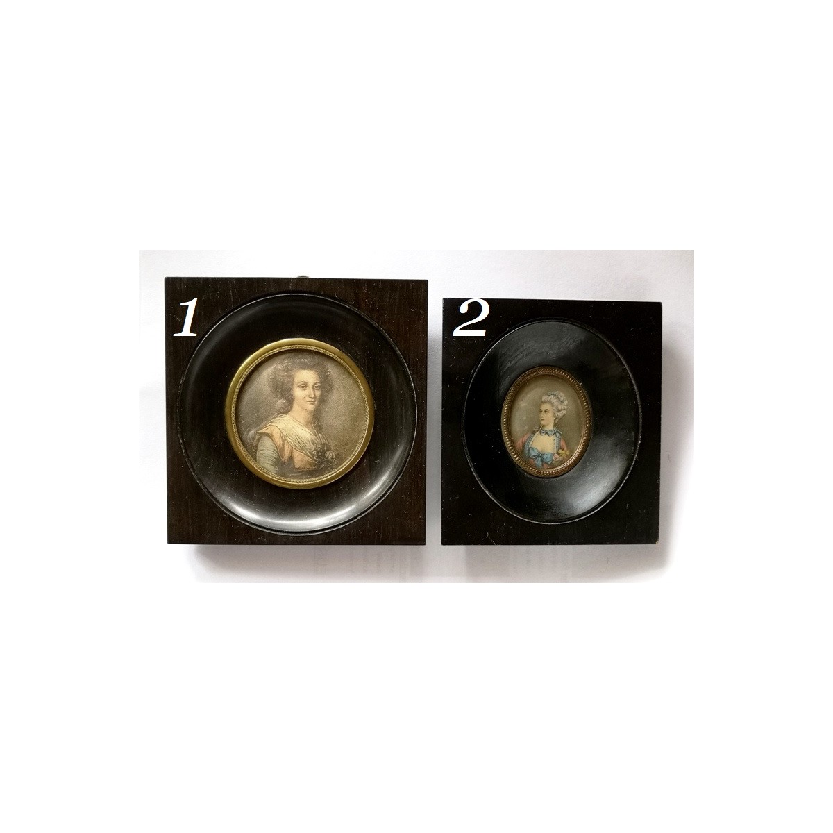De små og gamle miniature billeder er meget populære blandt samlere. Billederne er i mørke passepartout-rammer, der trækker blikket mod motivet. Der kan forekomme lidt brugspatina i rammen. PRISEN ER PR. STK.
