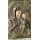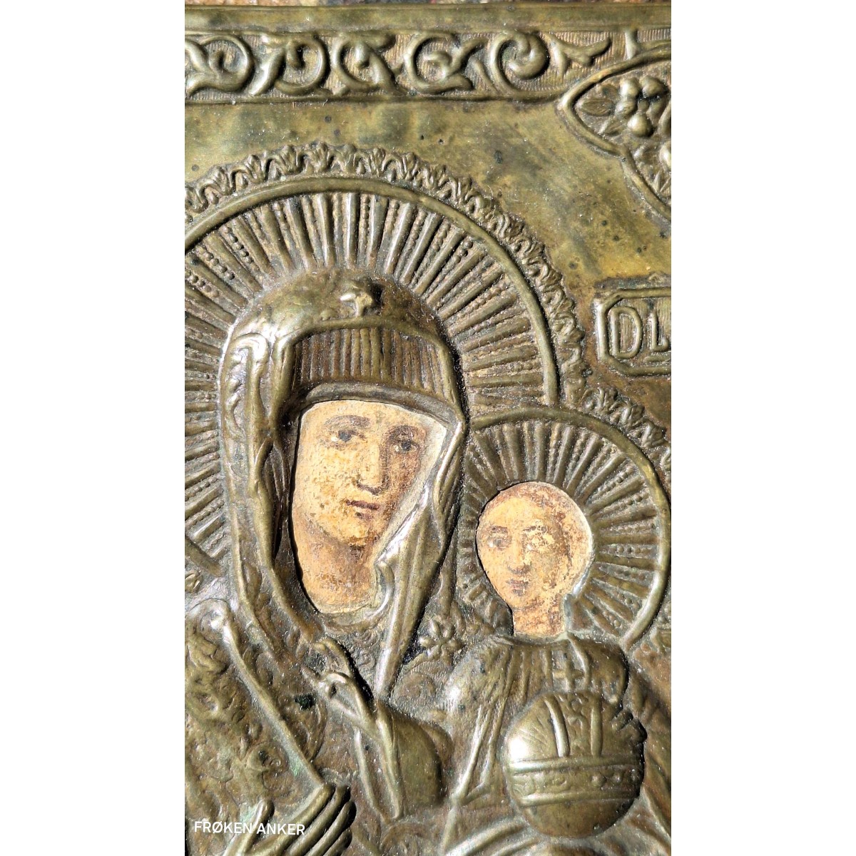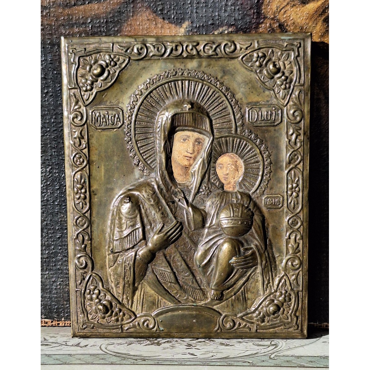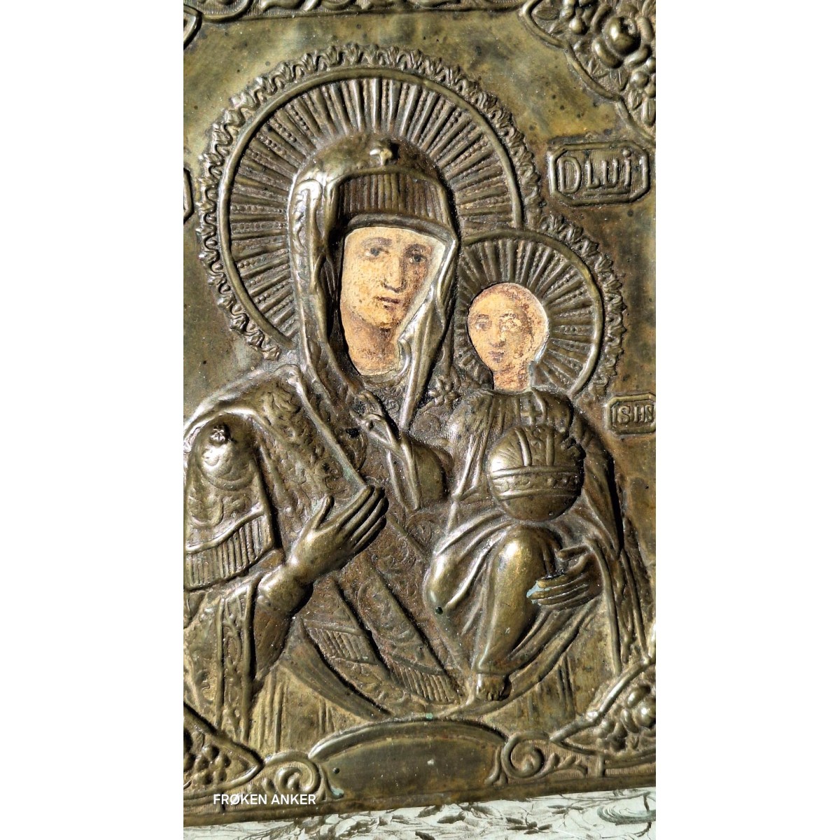 En smuk byzantinsk ikon med riza/metalbeklædning. Ikonen er håndmalet med Jomfru Maria og Jesusbarnet under metalpladen. Der forekommer slitage i maleriet. Materialet føles som pap, der er malet på. Og sat på træ, under metalpladen. Ikonen er fra 1800-tallet. En meget smuk ikon med brugsspor, og original patina.