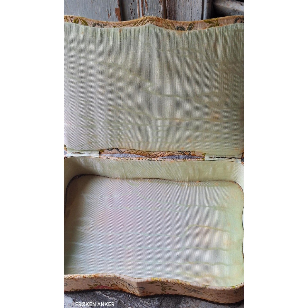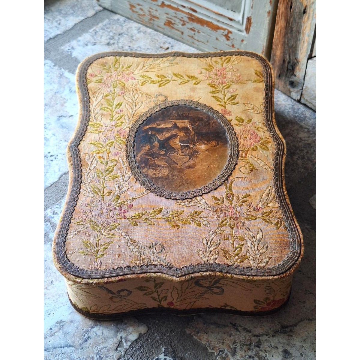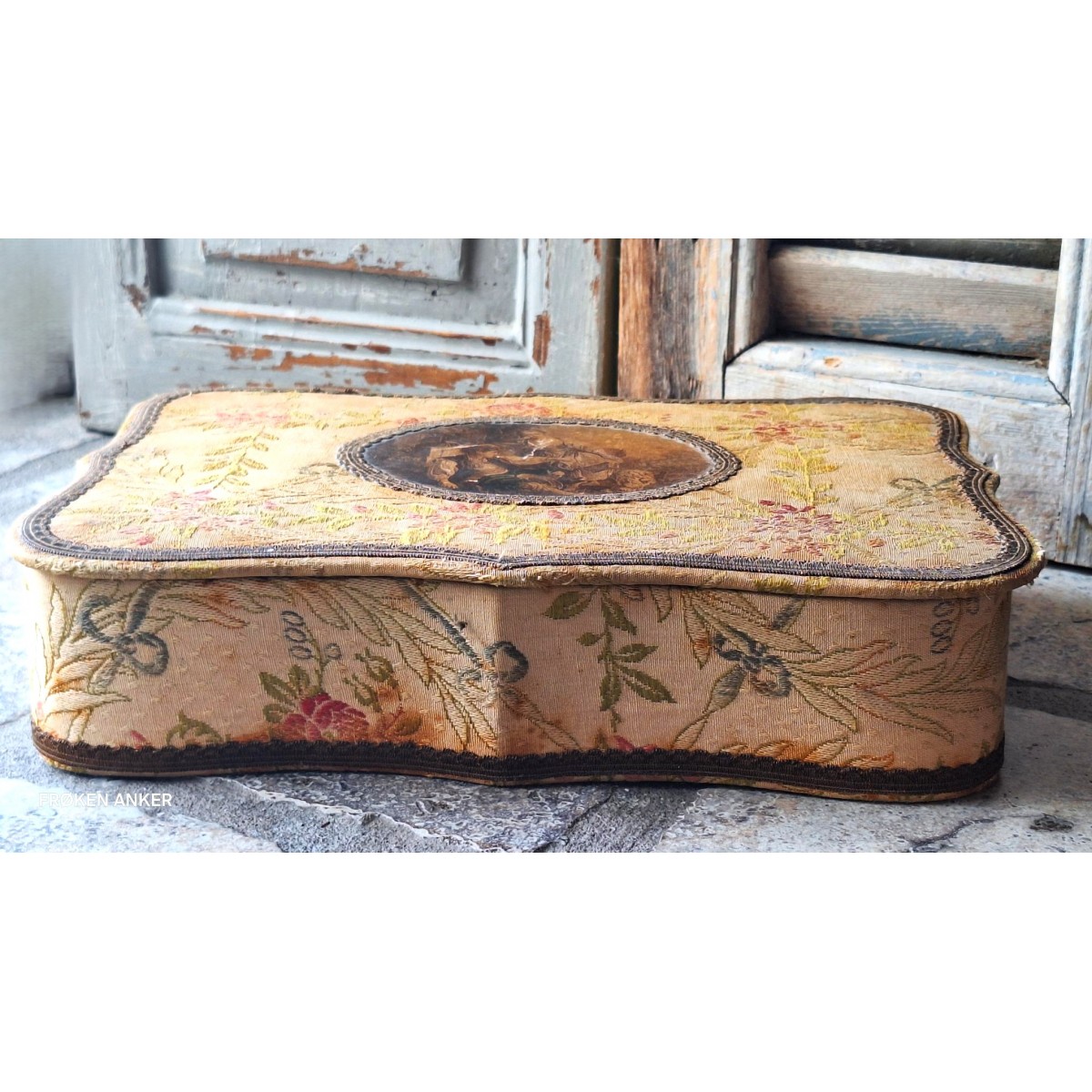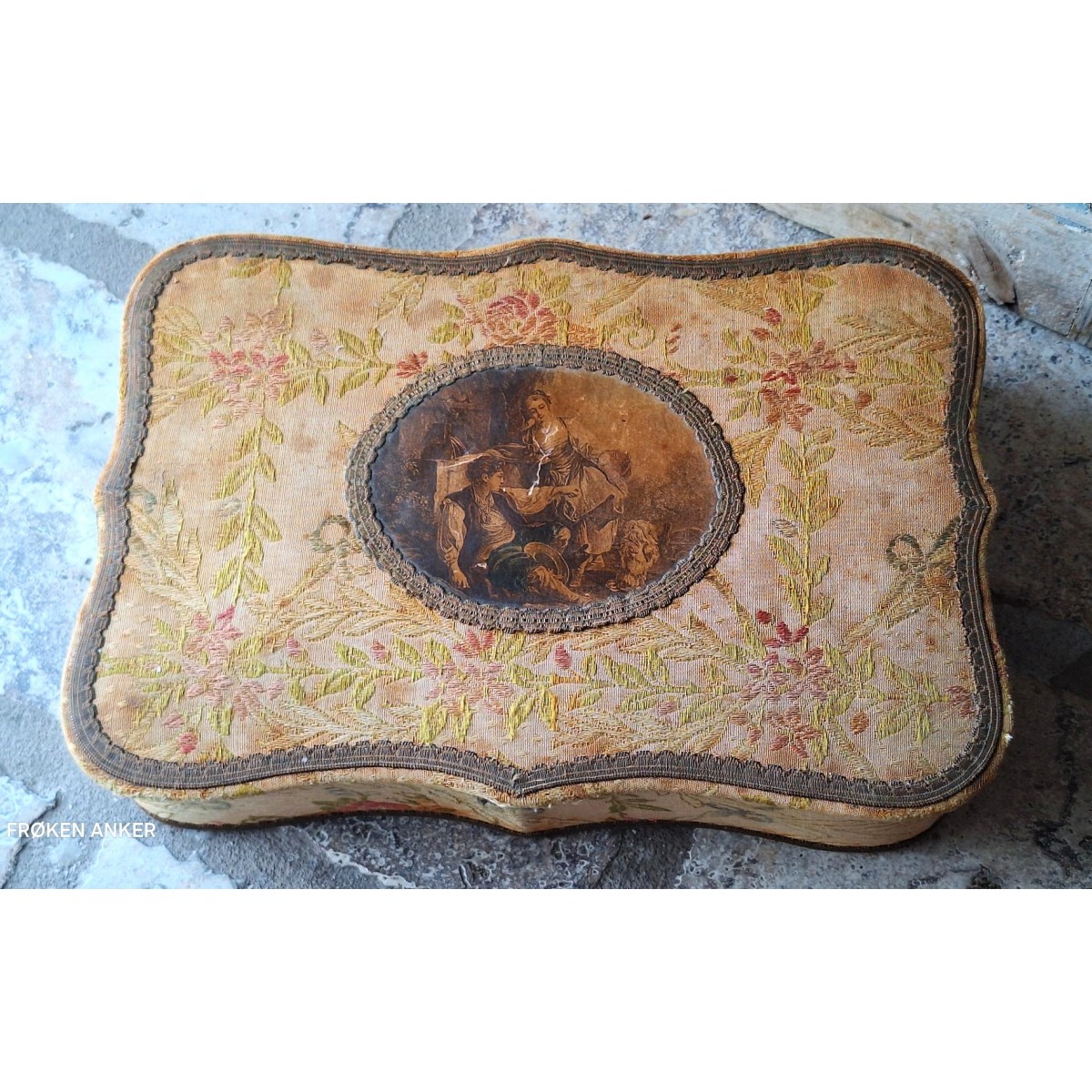 Den antikke stofæske har en anderledes form, med svungne linier. På låget er et billede. Æsken er beklædt med brokadestof, og inden i silkebrokade. Æsken har brugsrelateret patina forekommer...SE BILLEDER