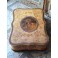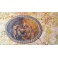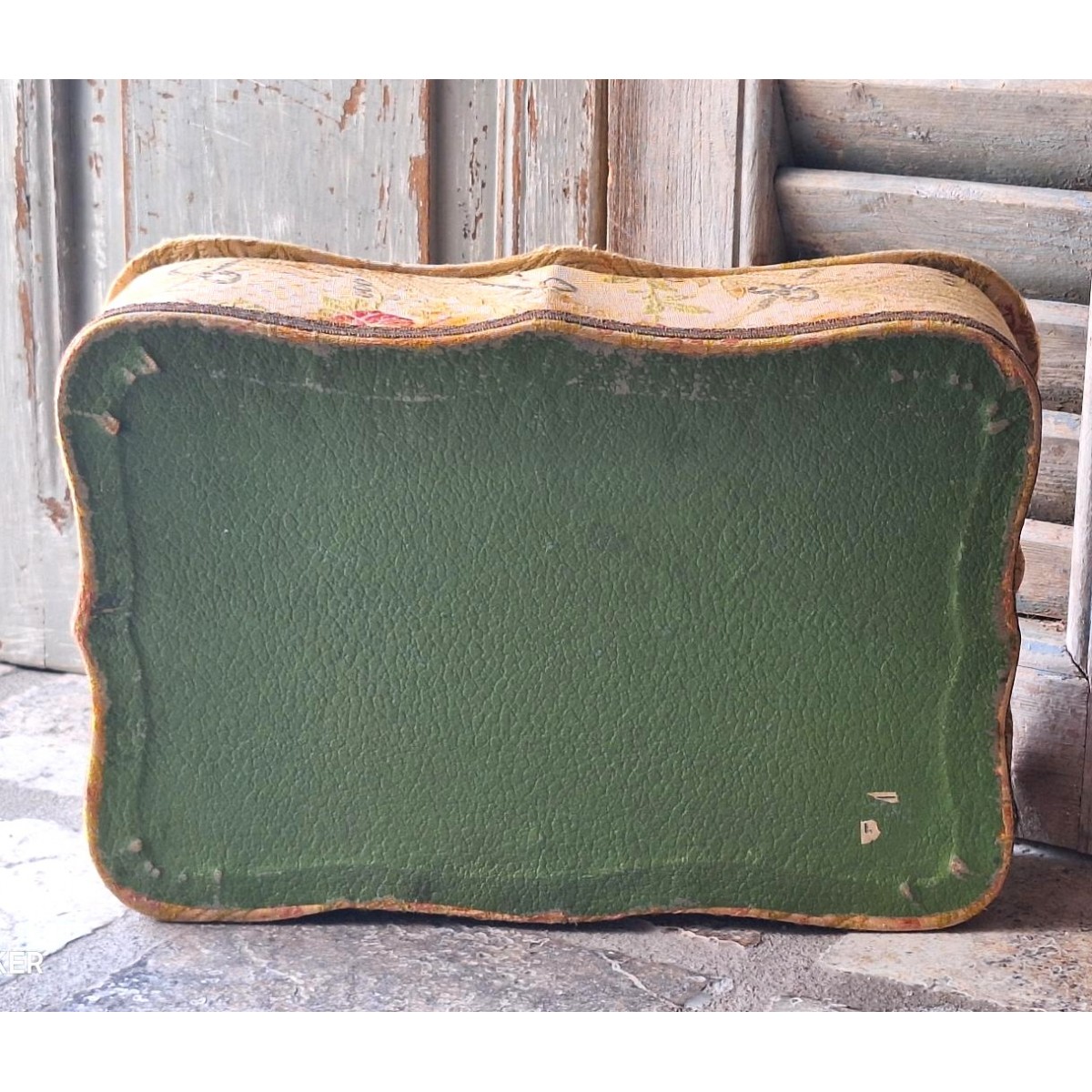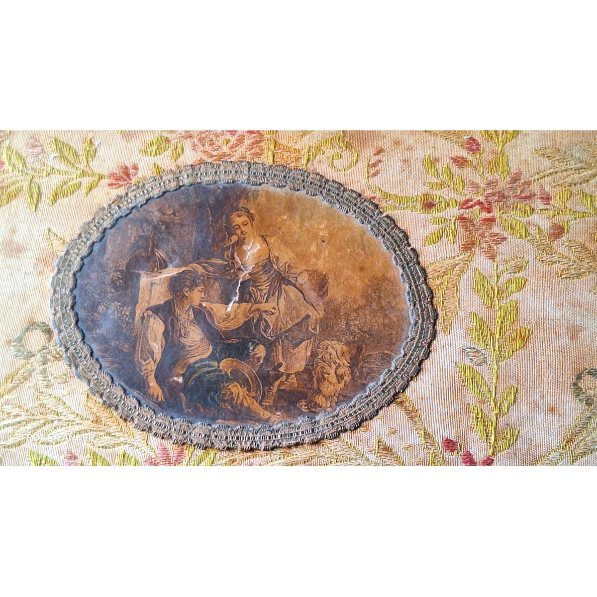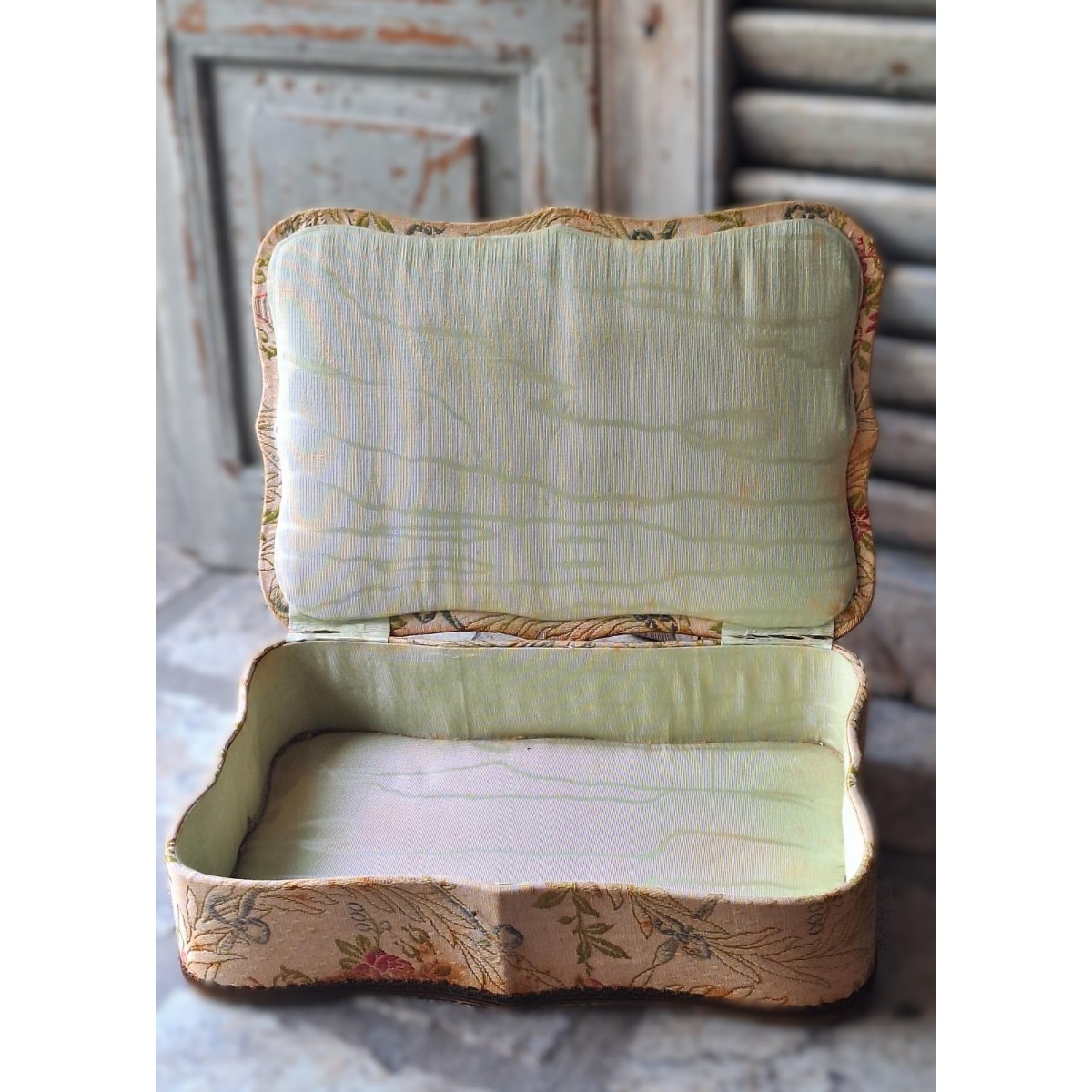 Den antikke stofæske har en anderledes form, med svungne linier. På låget er et billede. Æsken er beklædt med brokadestof, og inden i silkebrokade. Æsken har brugsrelateret patina forekommer...SE BILLEDER