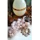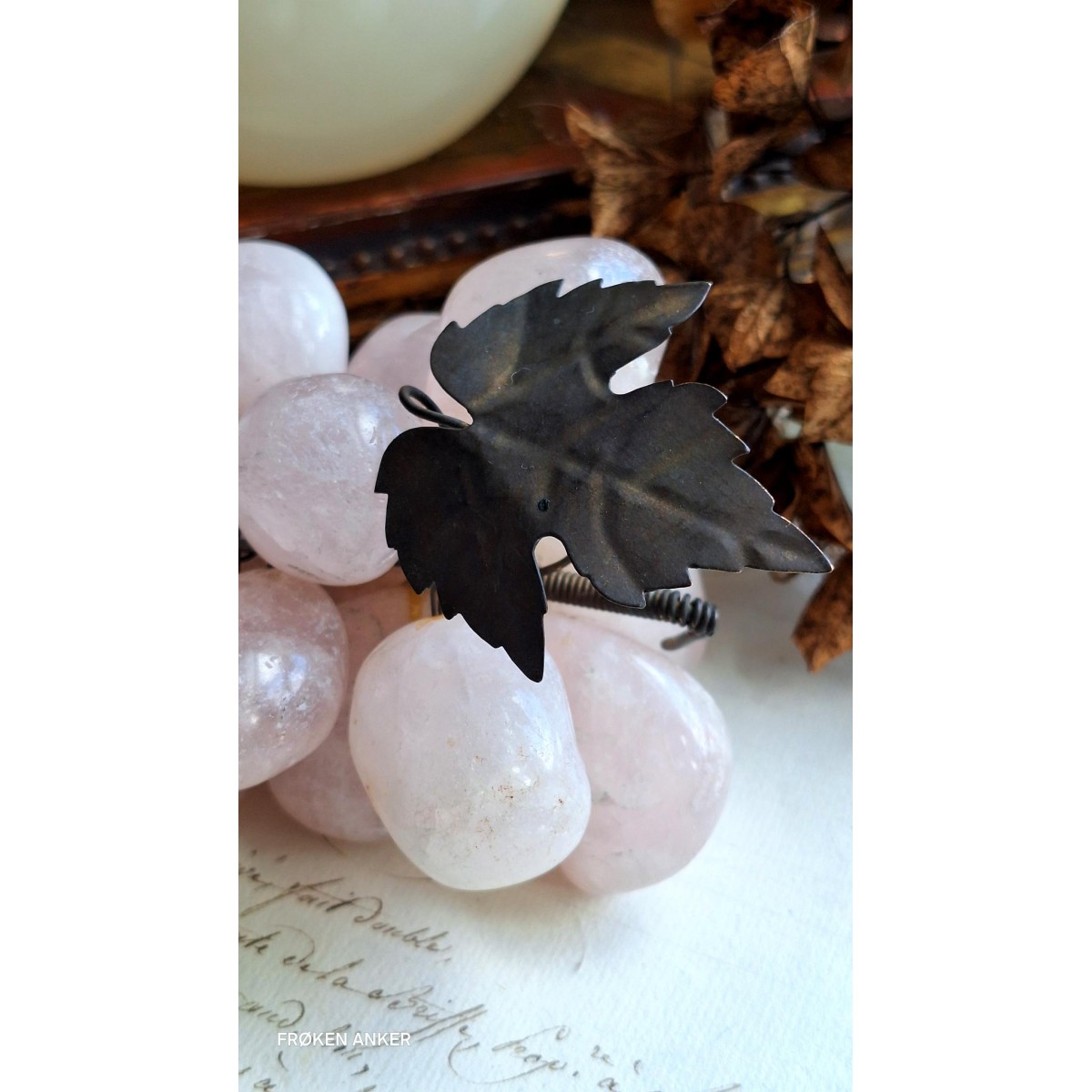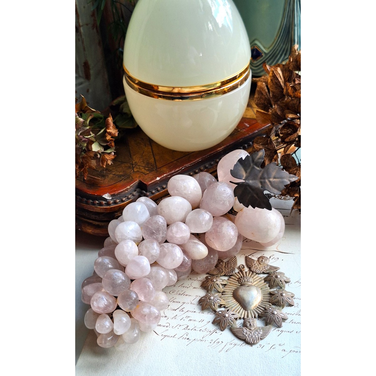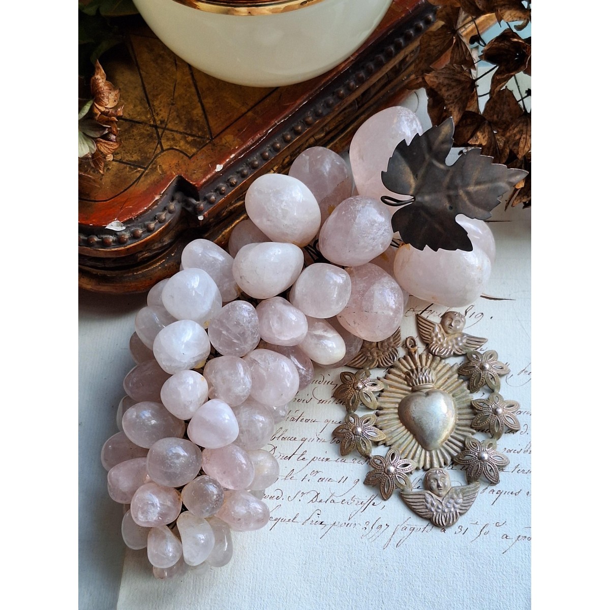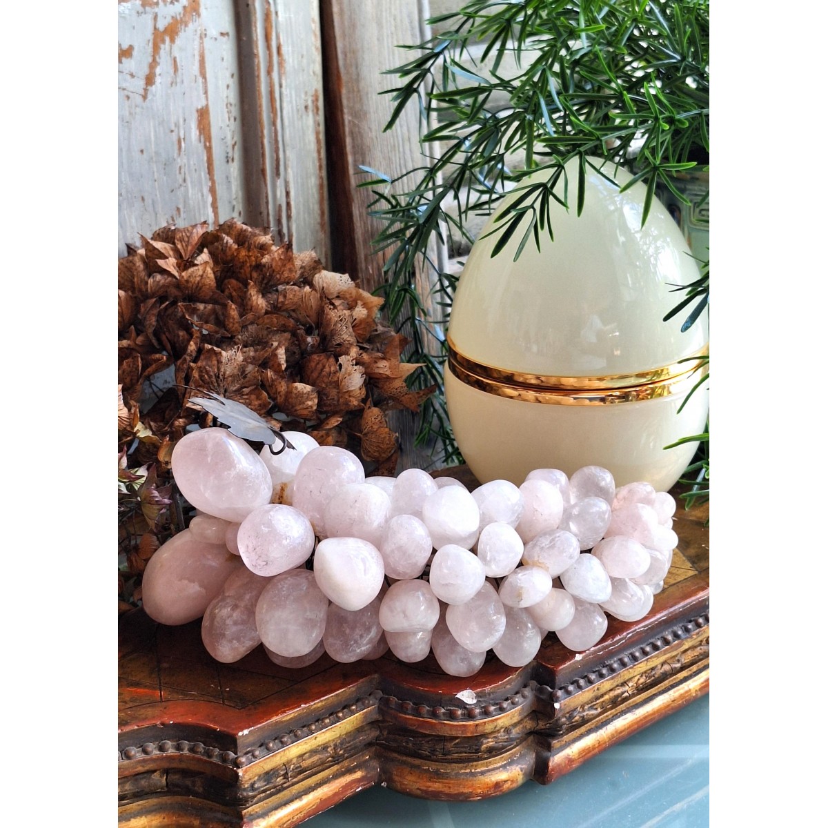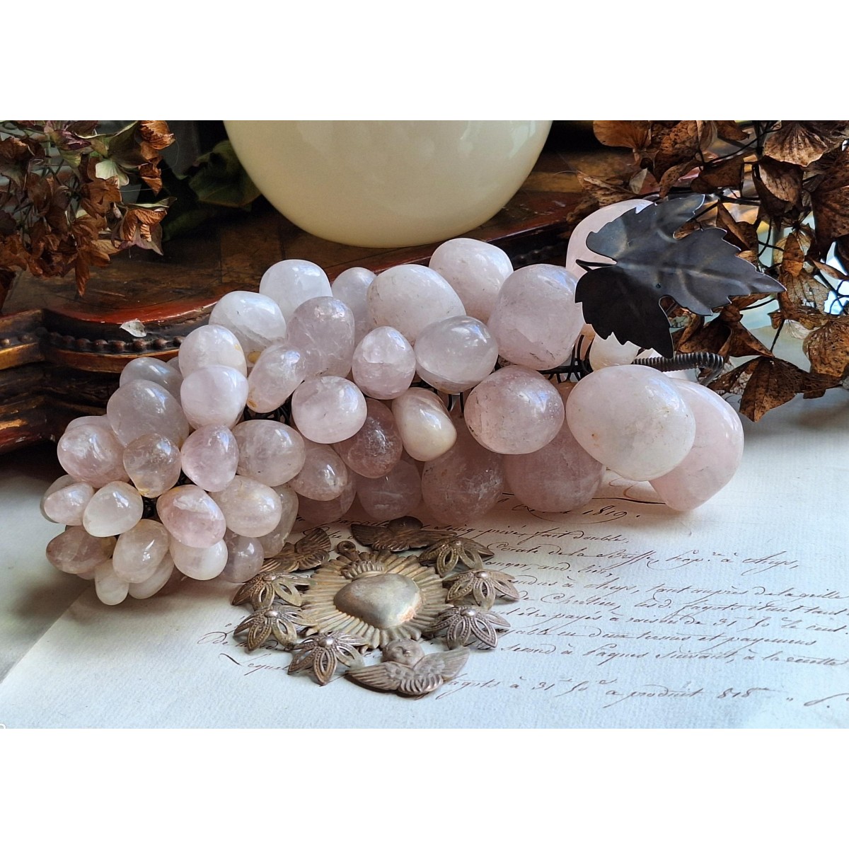 Fransk drueklase i rosakvarts. Meget dekorativ. Og en genstand, man har lyst til at røre ved. Drueklasen har fra naturen pletter og tekstur i stenene. Den er købt på et marked, så der forekommer brugsspor og patina.